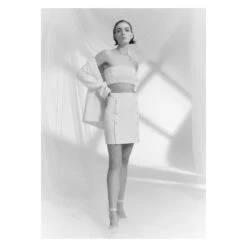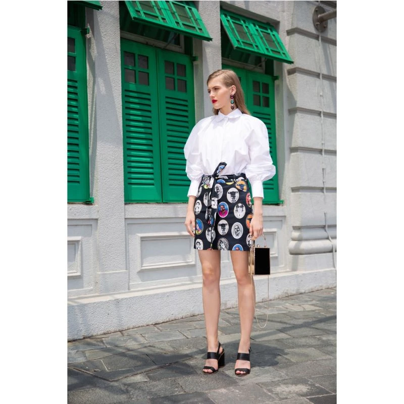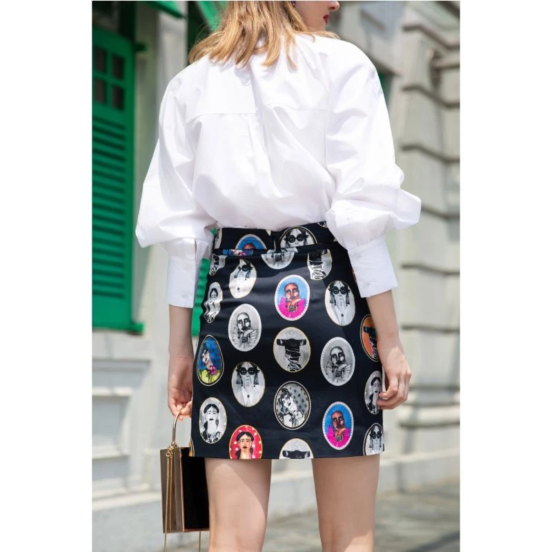 Agda is a mini skirt in a hand painted print. Comes with a belt in the same print. Zip in front and has a stretchy black lining.