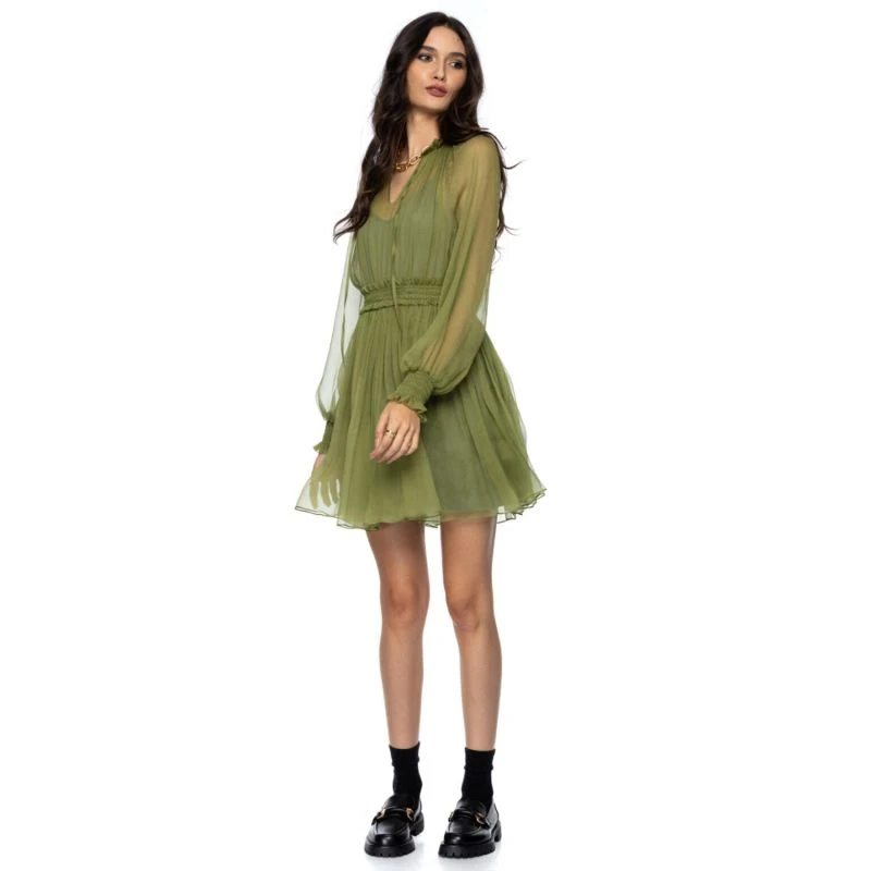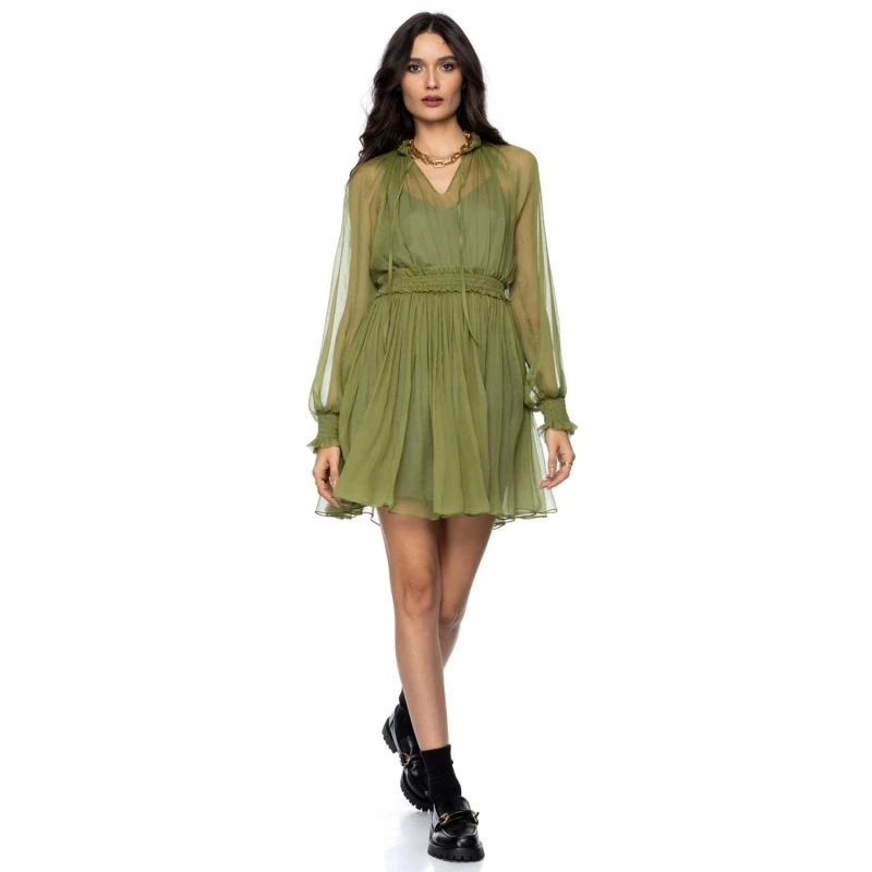 Elegant dress in green ocher silk Alexa, with long sleeves and V-neckline. It is made of precious green ocher silk. The waist is highlighted by the wide detachable belt, the natural silk will make you feel wonderful every day you wear it.