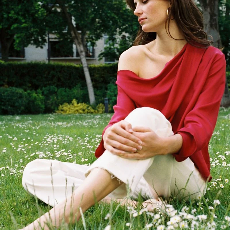 Maison O’s silk comes from Italy and is GOTS certified. This blouse is worn asymmetrically, exposing the shoulder for a sensual look. The cut is loose