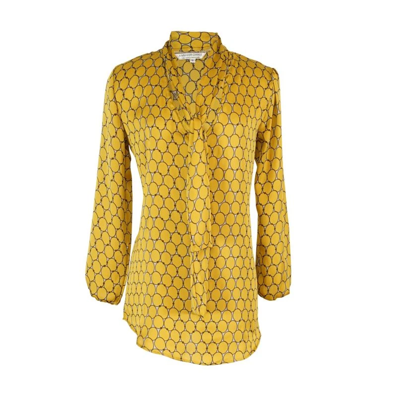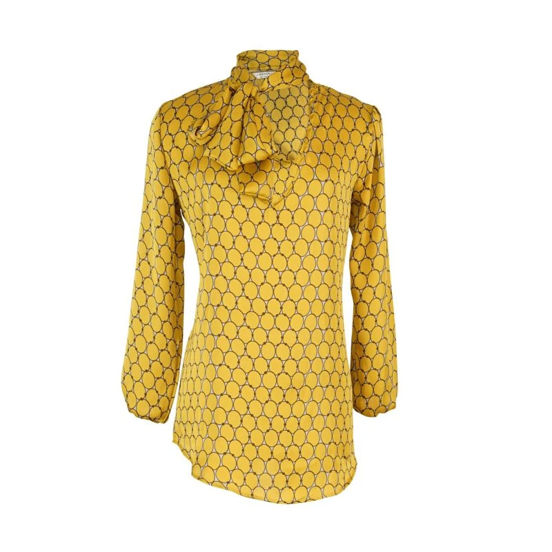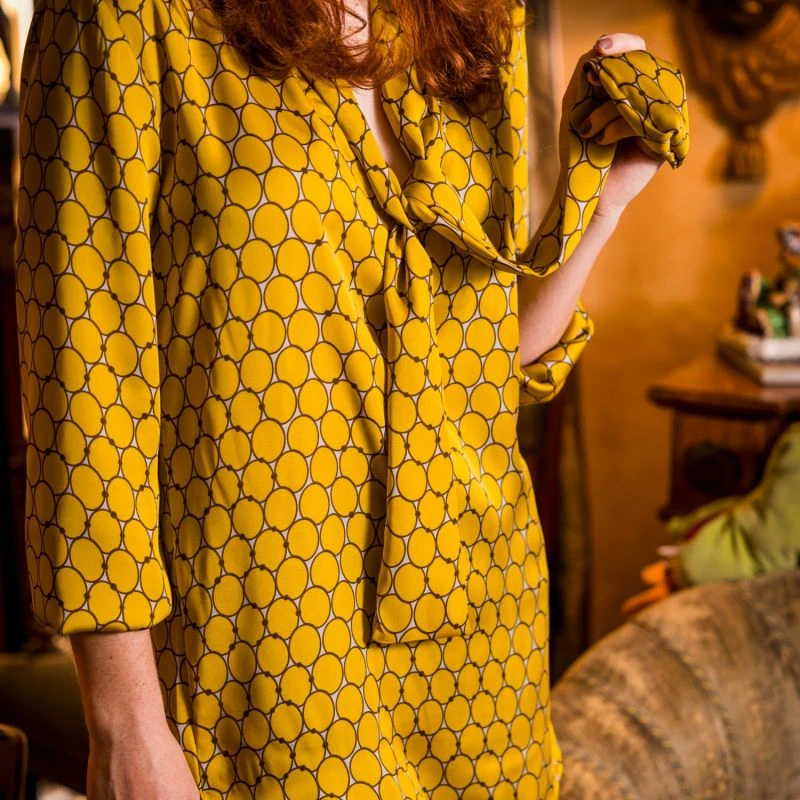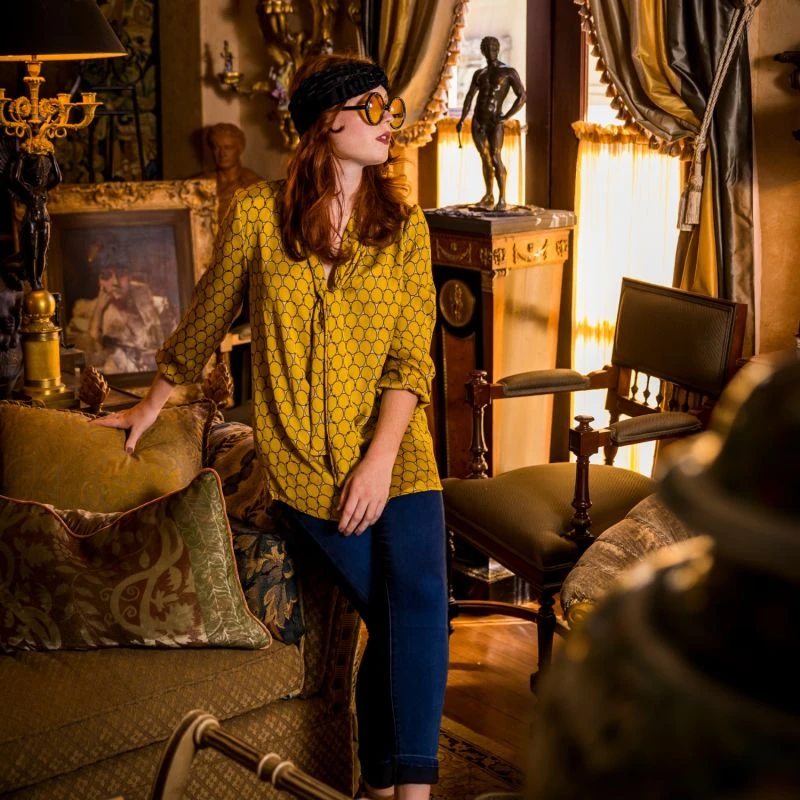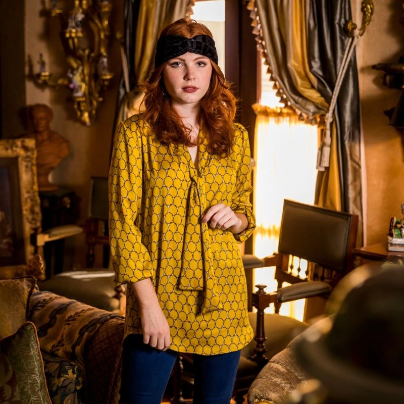 This limited edition glam rock inspired blouse is perfect from desk to dinner. Featuring a versatile bow front and an opaque satiny rayon mod print fabric.