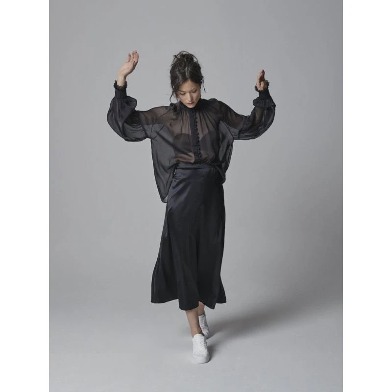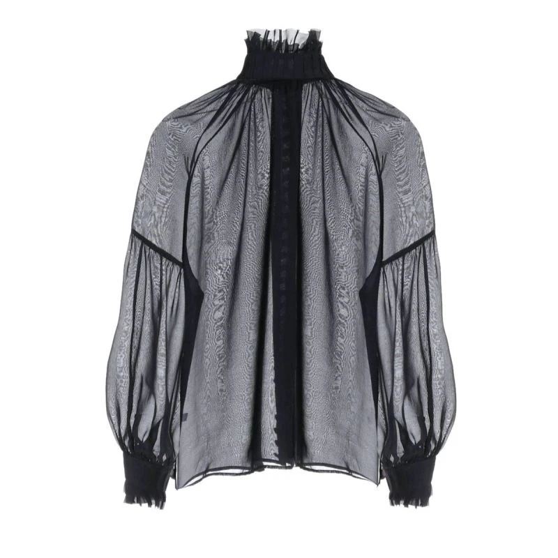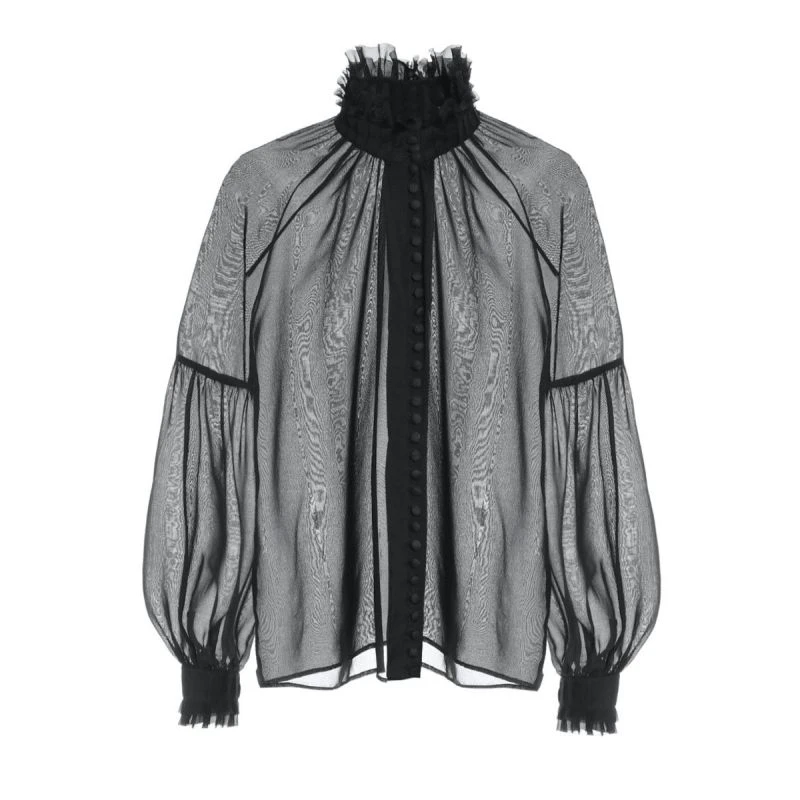 Long sleeve chiffon silk blouse with intricate collar trim and full length button placket.