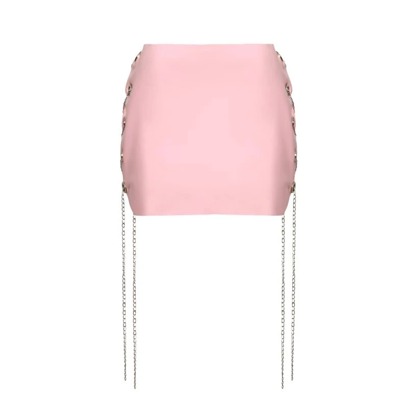 Baby. pink mini latex skirt with eyelets and chains to adjust, this latex is stretchy
