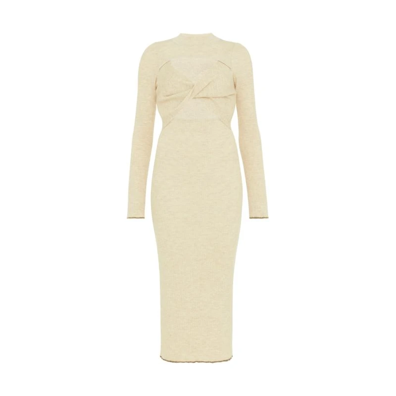 Long sleeve, midi dress detailed with a twist at the front and cut out details. The ribbed-knit style has a flattering slim silhouette with mock neck.