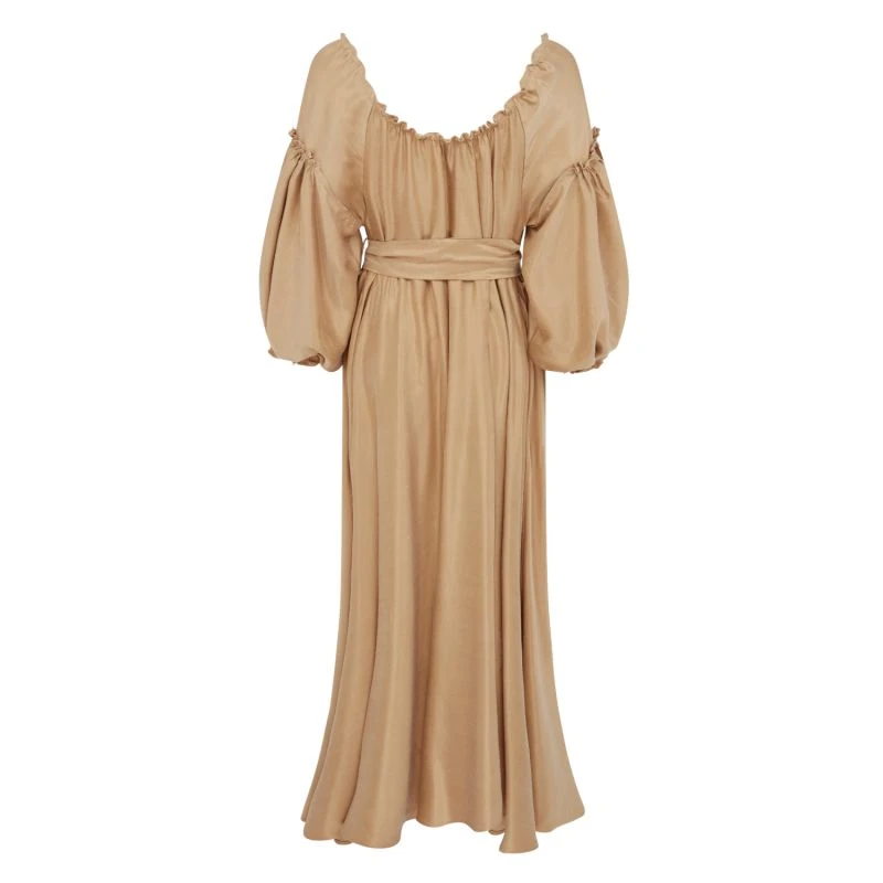 A fitted bodice with a gathered ruched bustline which forms a sweetheart neckline. The sleeves are voluminous with gathering into elasticated cuffs to create a fun puff sleeve silhouette.