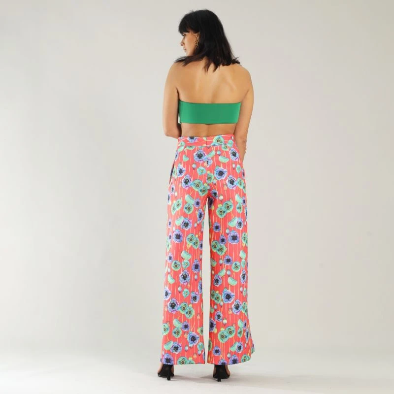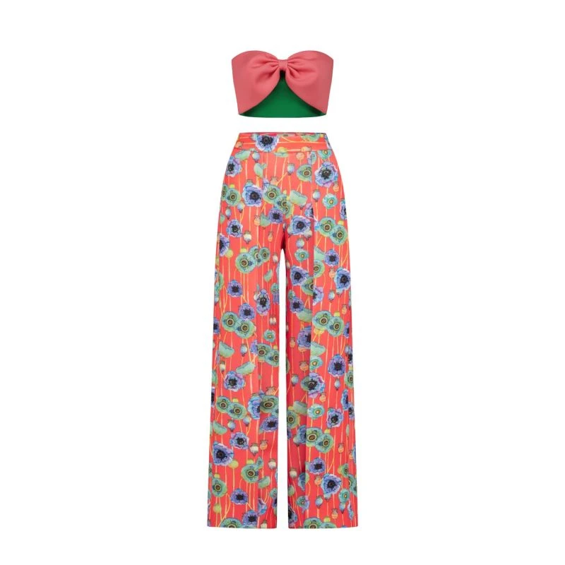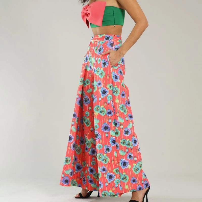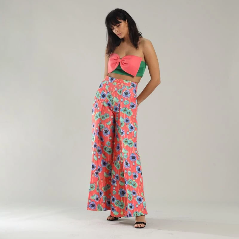 The Bow Top is a bright cropped top and is made of a stretchy material with a zipper on the side. It can be worn as a stand-alone piece, or even style it as an outer layer. The Floral Palazzo Trousers are a must-have for summer, versatile and easy to style. The cut is made for a comfortable fit. Fabric is stretchable, and with a beautiful floral pattern.