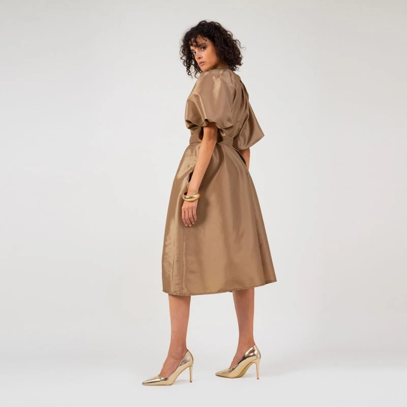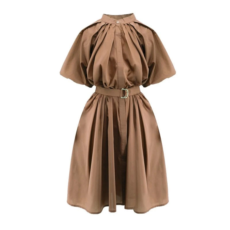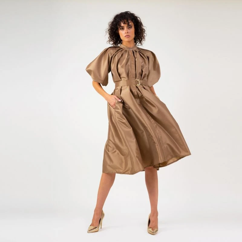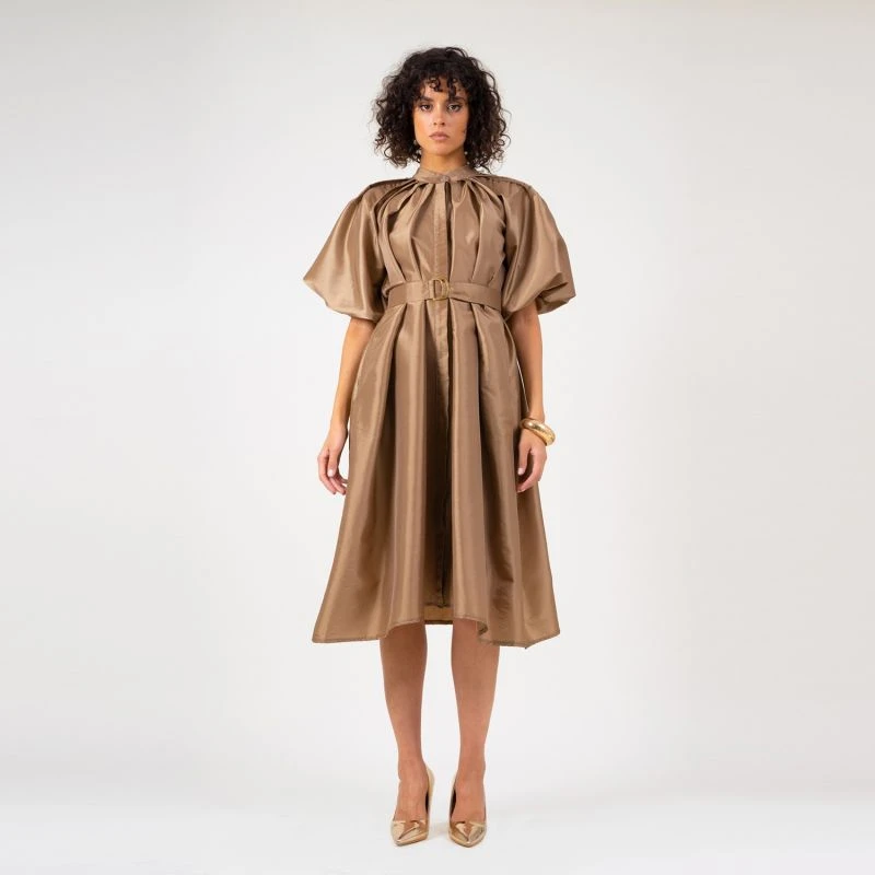Bronze dress with raglan sleeves and pleats, accesorized with a cord with a gold buckle.