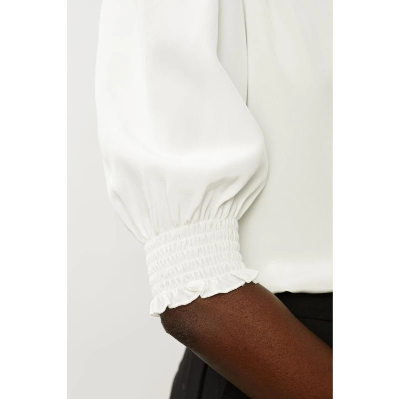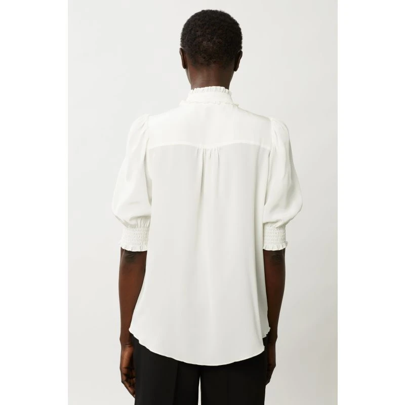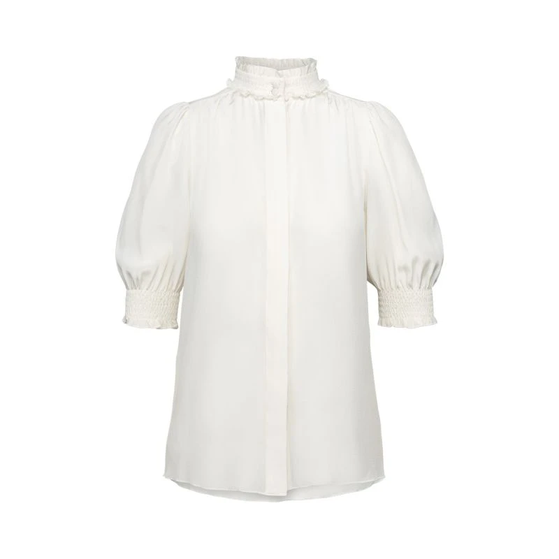Carrie is cut from 100% silk crêpe de chine. A loose fitting and feminine short-sleeve blouse with intricate smocked details at neck stand with a small framing ruffle and fabric covered shank buttons. Puff sleeves with slight volume pinched in again by an elastic smocked cuff ending above the elbow. Feminine shirring at the back and front shoulders. Hidden buttons at front placket for a clean look. The length is to lower hip.