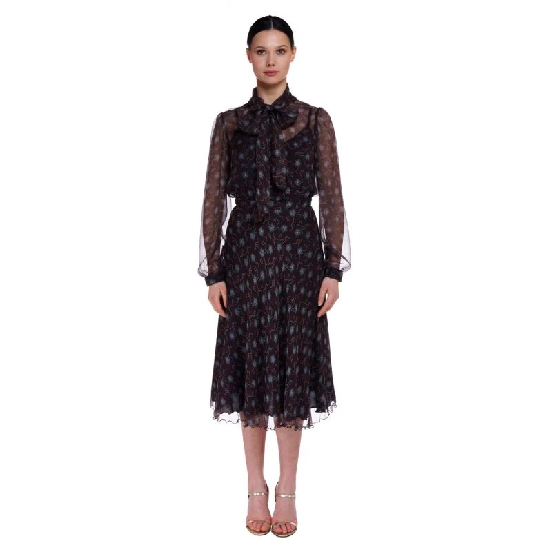 A long flowing half-wheel skirt made with a layer of blue coloured silk fabric underneath a delicate patterned brown silk chiffon, with a hint of red and blue. This is a versatile skirt where you can just change your shoes and accessories and be ready to go. Wear the skirt with our chocolate patterned silk blouse in matching fabric or a classic white organza blouse.