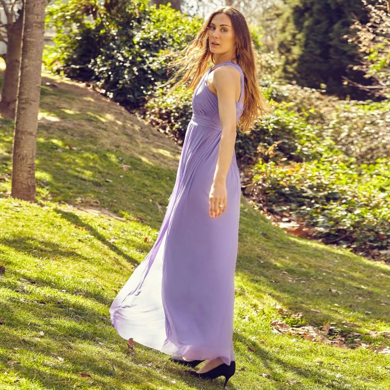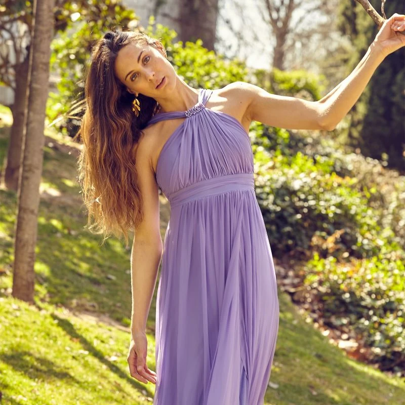 Our best seller dress. Violet ankle-length dress with a triangular neckline.It has no straps and it is held from the neck with ribbons that come from it to the back. It is gatheredat the waist with a piece that acts as a belt as well as a decorative element. The dress is gathered vertically throughout the entire piece. Elegant and formal dress. Don’t forget see all our collection for complete your look. With our bags and jewelry you will complete your amazing look.