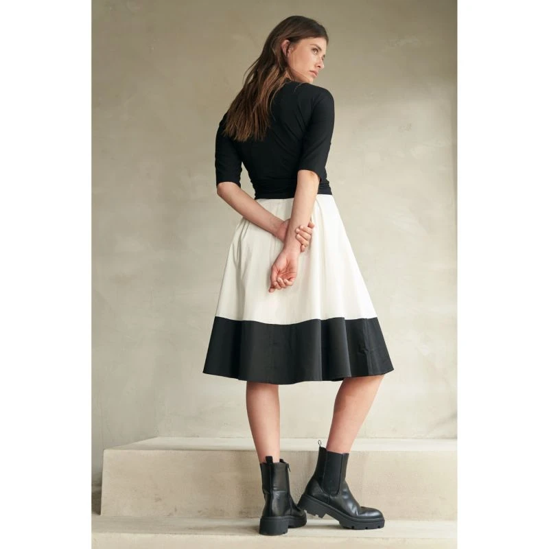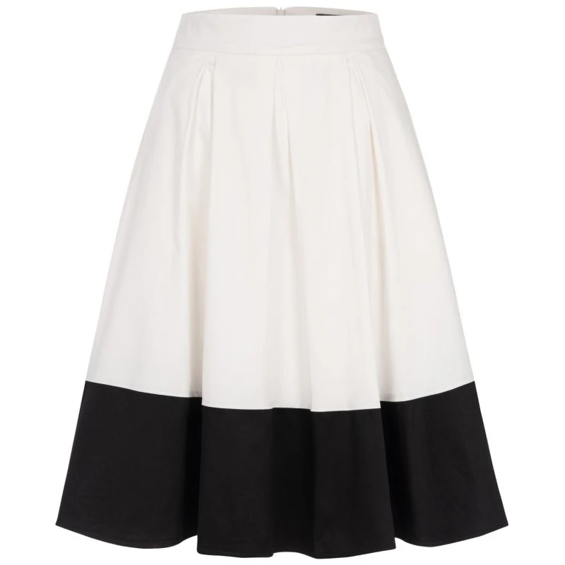 A staple piece to wear with our shirts and blouses, this sateen skirt is styled with box pleats and a contrast-color hem. The two-tone skirt hits right at the knee for a flattering cut that strikes the perfect balance between bareness and coverage. A hidden back zipper and on-seam pockets create sleek, clean lines for a polished look.