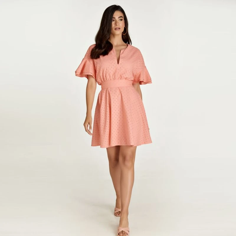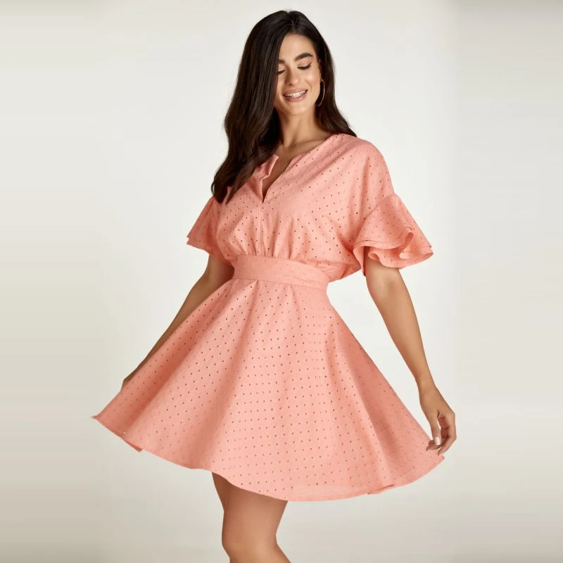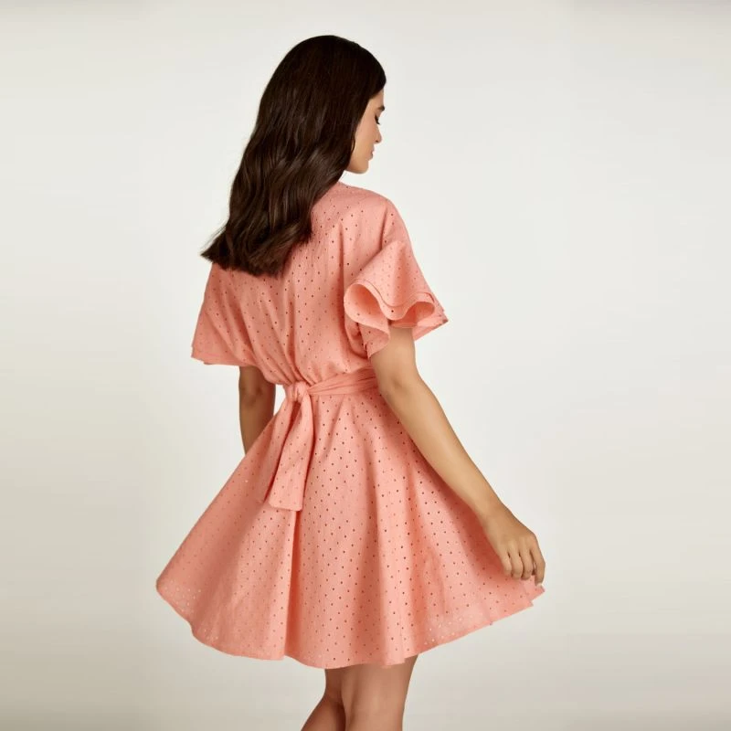 This coral dress is crafted in woven cotton fabric embroidered tone on tone. It has short double ruffle sleeves and drop shoulders. It has a round neckline with a V opening in the front. Below the bust is a curved seam under which the dress opens out into a cloche style. There is a concealed zip on the interior allowing the dress to be pulled on easily. It is lined. The dress can be worn with or without the belt which is made in the same fabric. The belt is included.