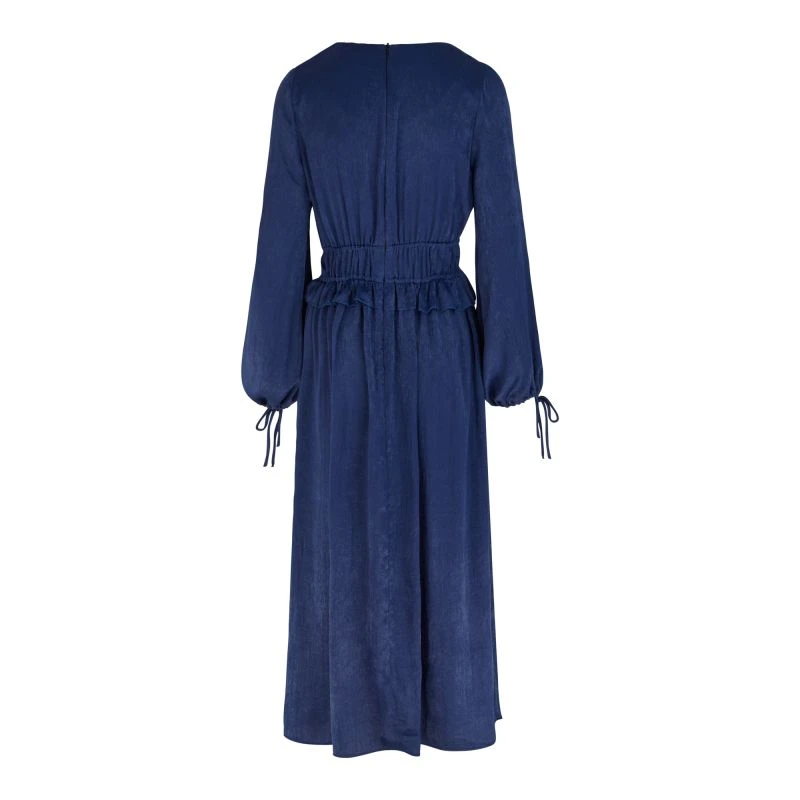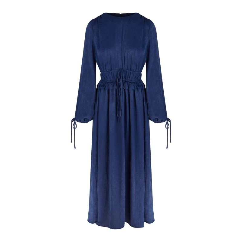 The Dahlia dress has a loose-fitting silhouette with long sleeves and a flattering ruched waist and tie detail. Made in a shimmering midnight blue polyester. Fastens at centre back with concealed zip. Pair with boots for a perfect day to night look.