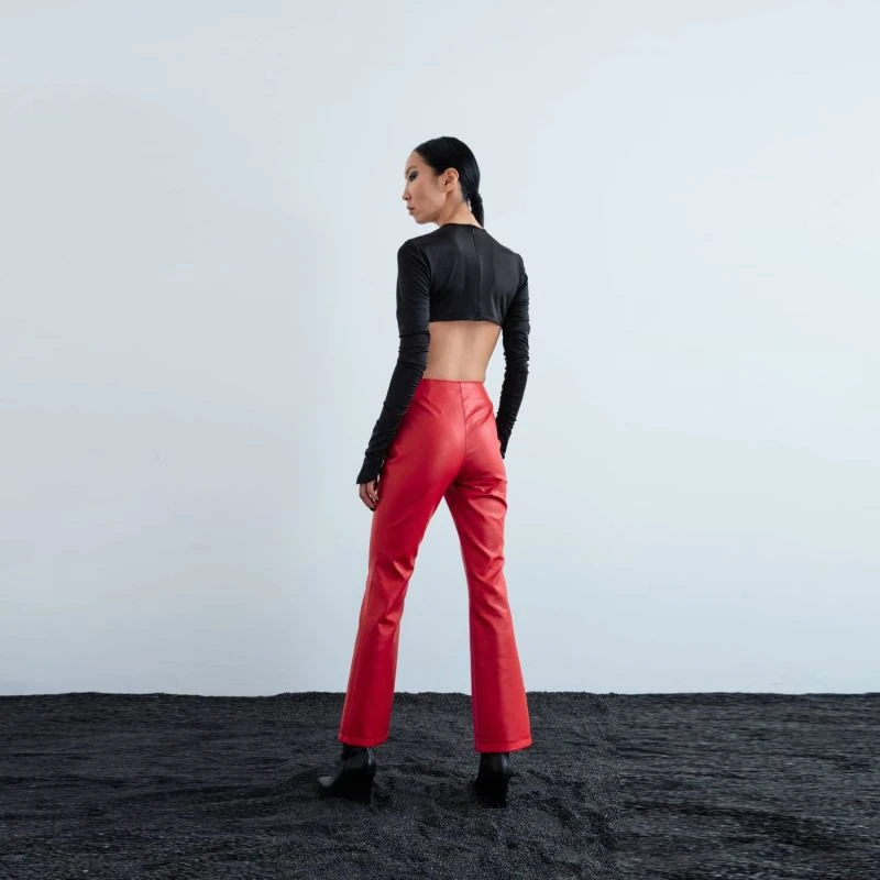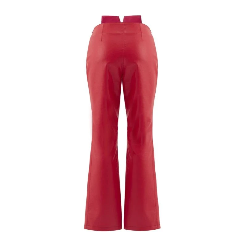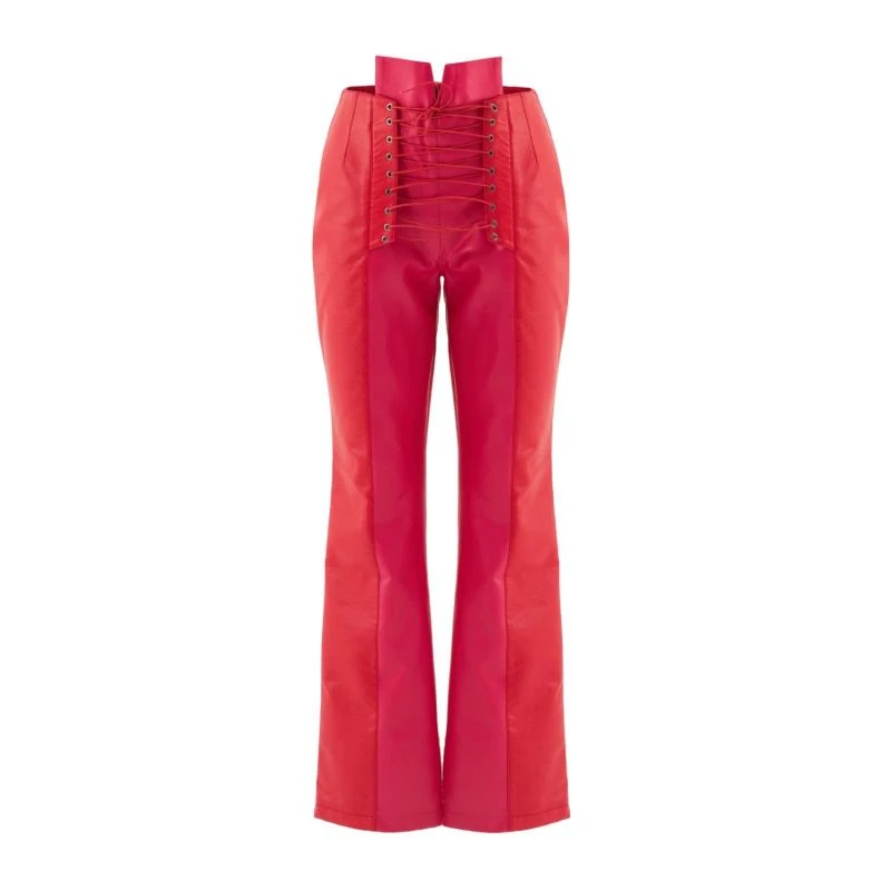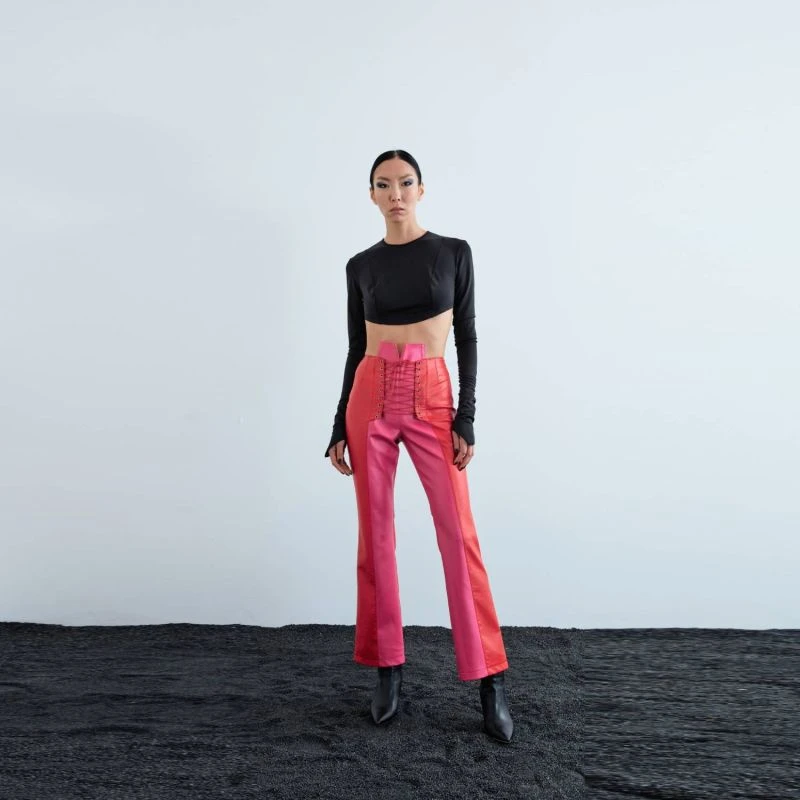 Two-toned vegan leather pants featuring a corset belt. Side zip closure.