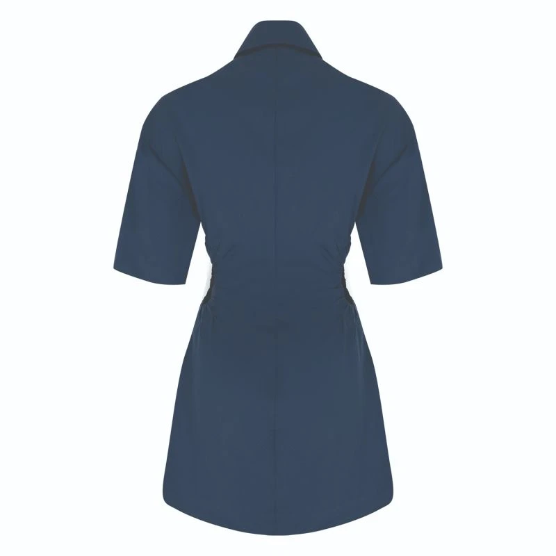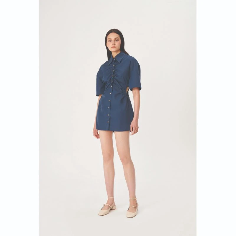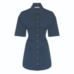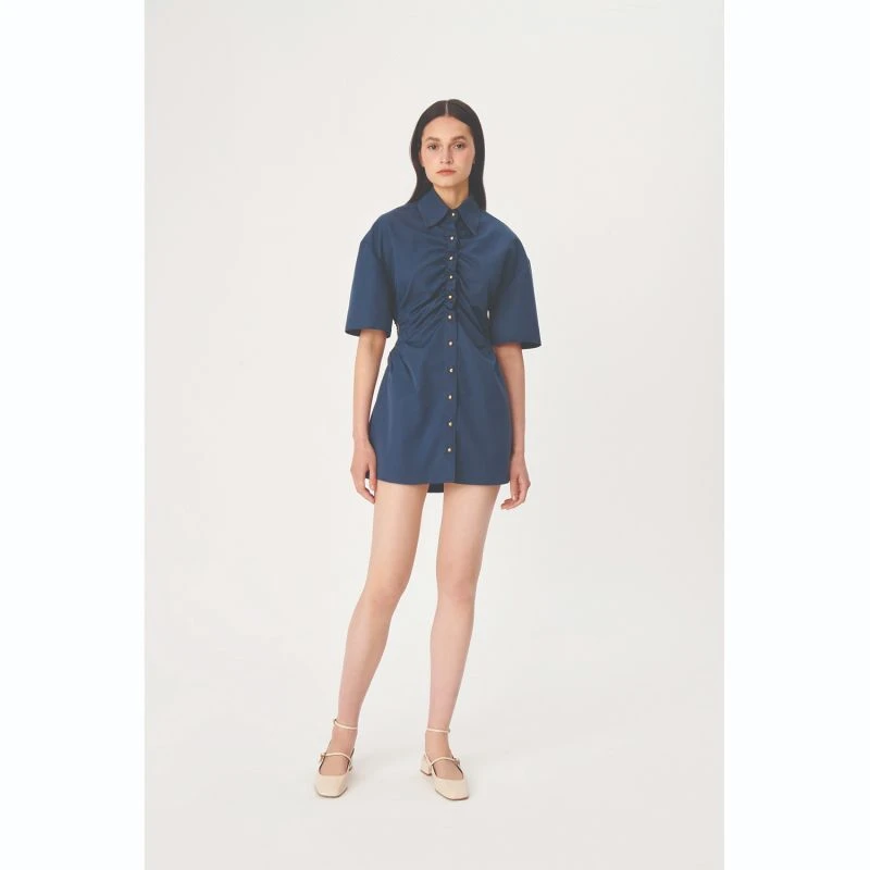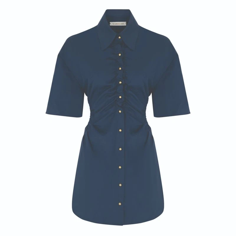 The dress is part of the Luce del Sole collection. It is a shirt dress that has been reimagined with modern elements, creating a timeless piece. This style features a striped waist and neckline detail, adding a touch of richness to its design. The shirt dress can be paired with any item from the WABISABI wardrobe for a modern look.