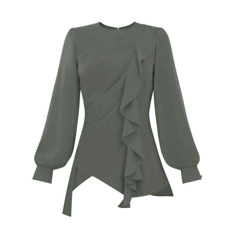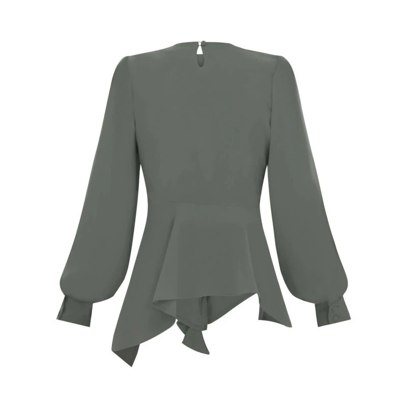 Artisanally crafted, it strikes a romantic note with its round neckline, bishop sleeves finished with a delicate loop closure, asymmetric peplum hem and drape detailing.