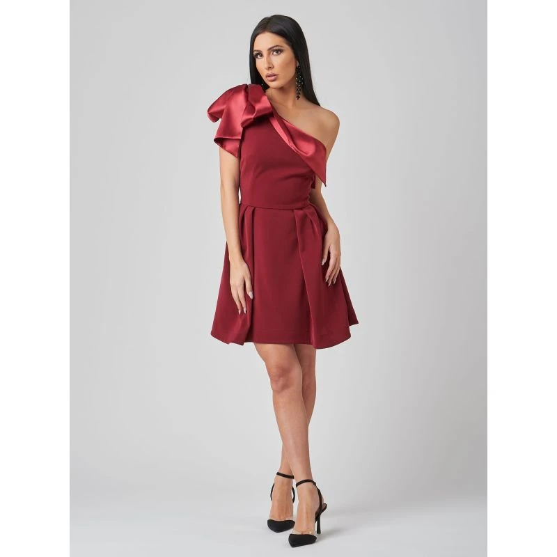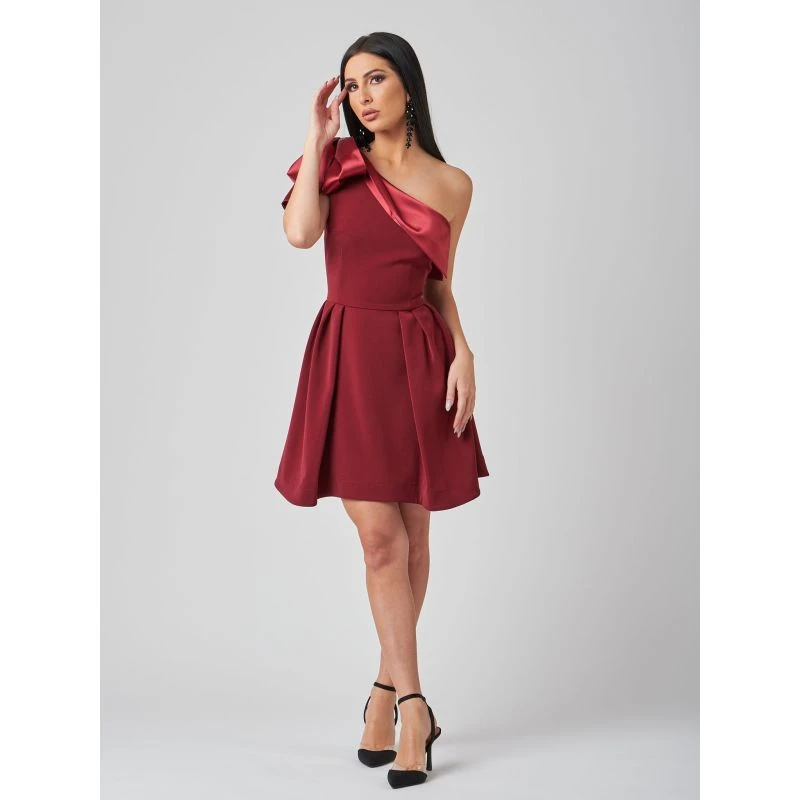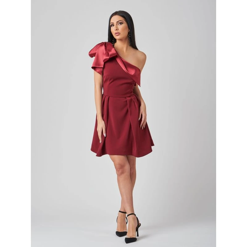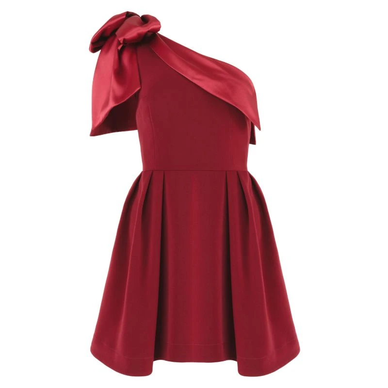Presented in a lavish red hue, the design grabs attention due to its ribbon detailing on the shoulder and dramatic pleats and A-line flare.