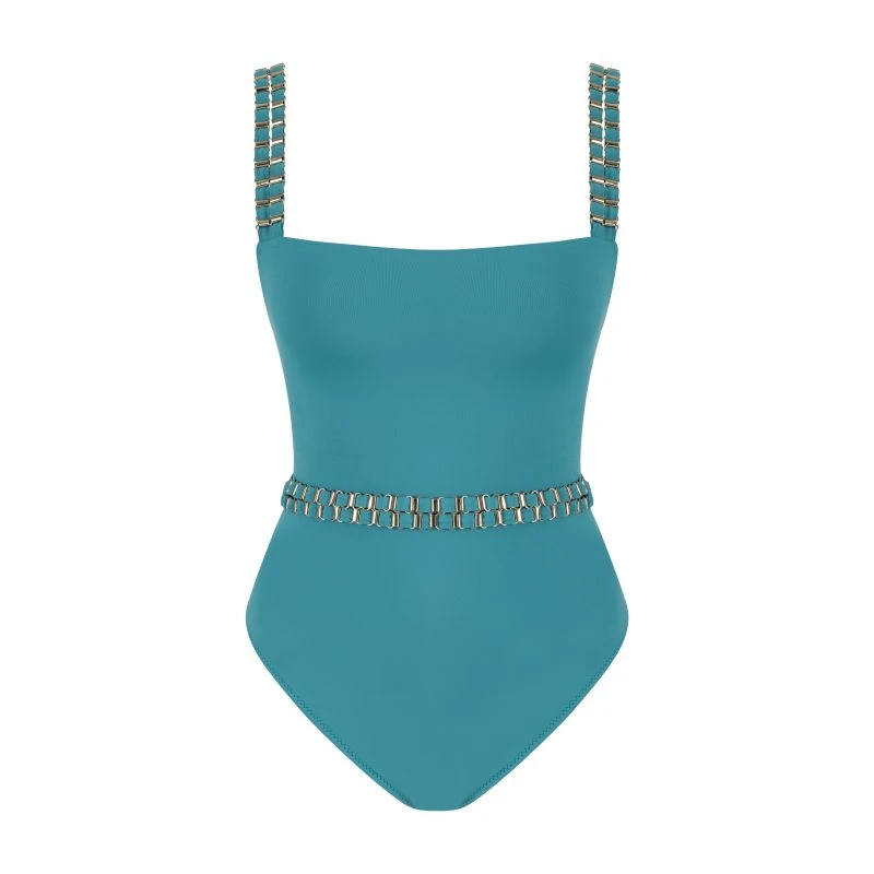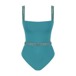 Gold plated belt detailed blue swimsuit