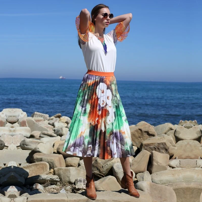 Colorful floral prints and an elastic orange waist will get the attention! It makes it very easy to mix and match different color tops with its colorful floral prints. It has a comfy fit with the elastic waist and the covered zipper. This skirt comes with a white lining.