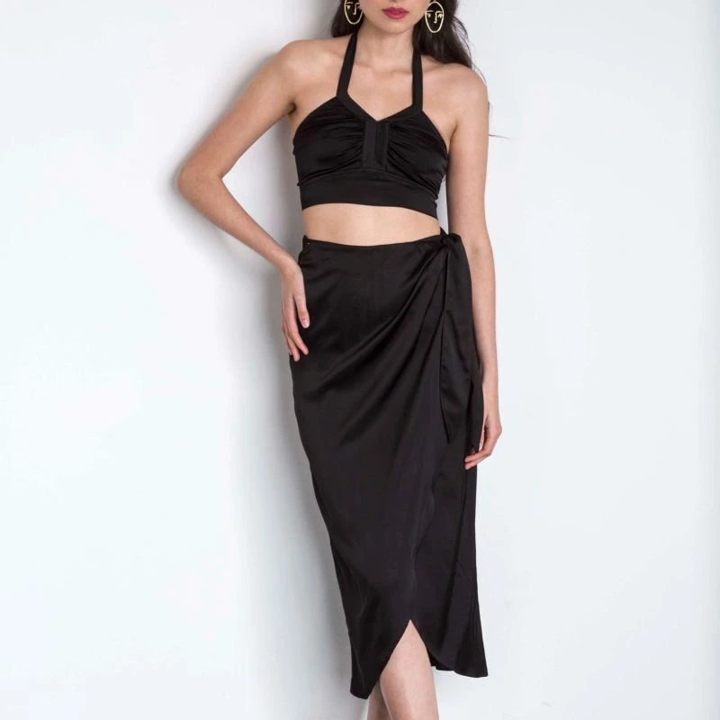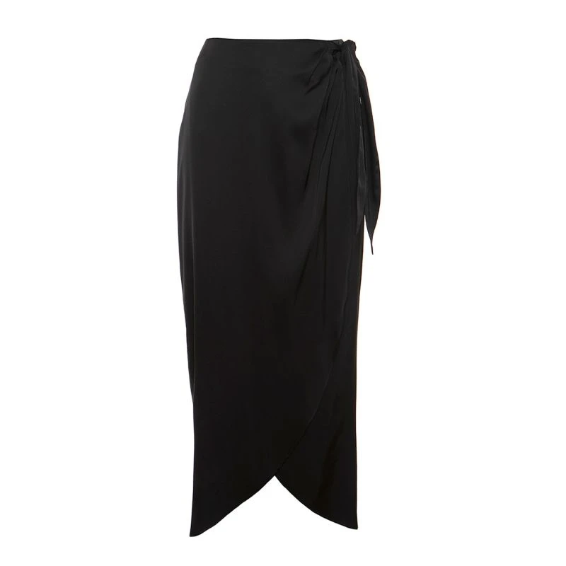 Freya skirt is designed in a flattering wrap silhouette that ties at the hip, creating a draped effect. It has two internal buttons to adjust the waist. Easy wear, from day to night.
