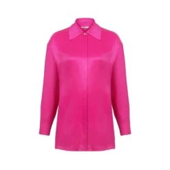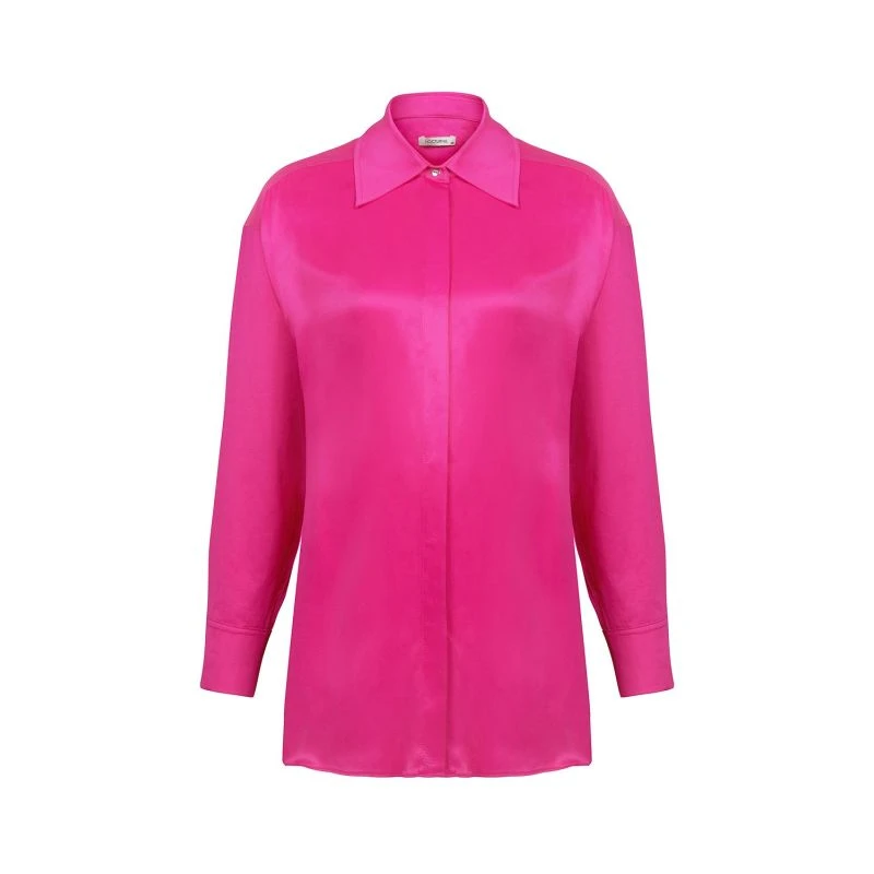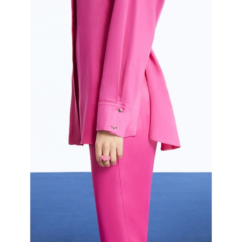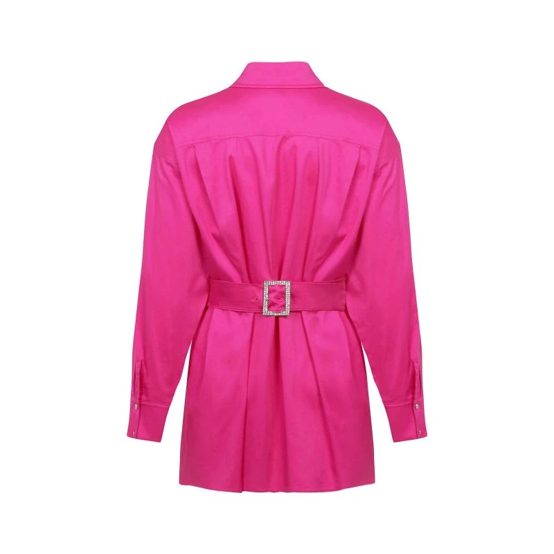 Buttoned shirt with long sleeves and cuffs. Adjustable self-belt at back. Side slits at hem.