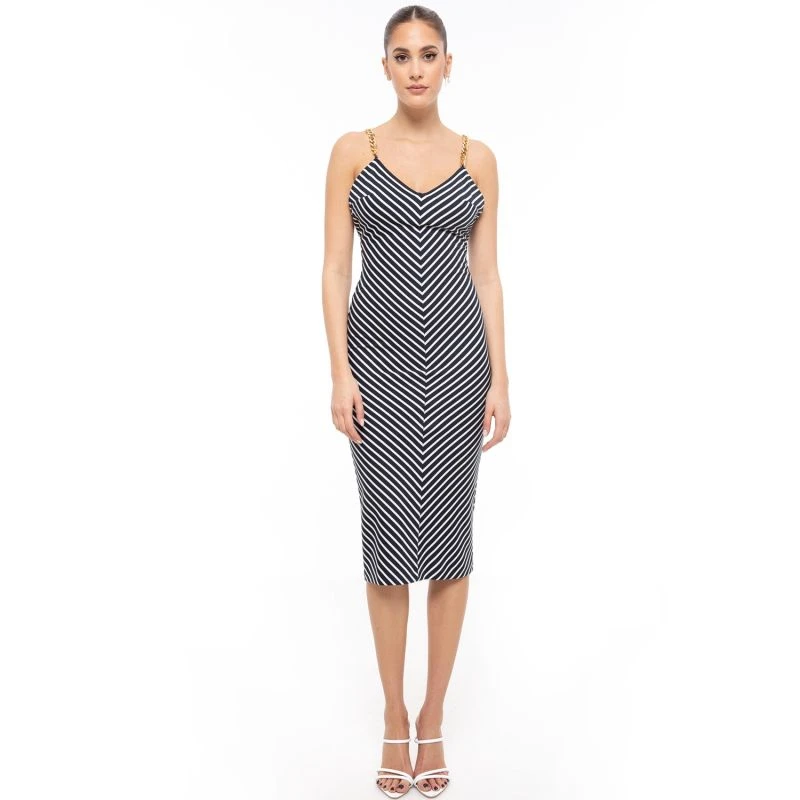The product is made out of printed fabric, has midi length with low-cut back and spaghetti straps. It has chain detail and zipper closure.