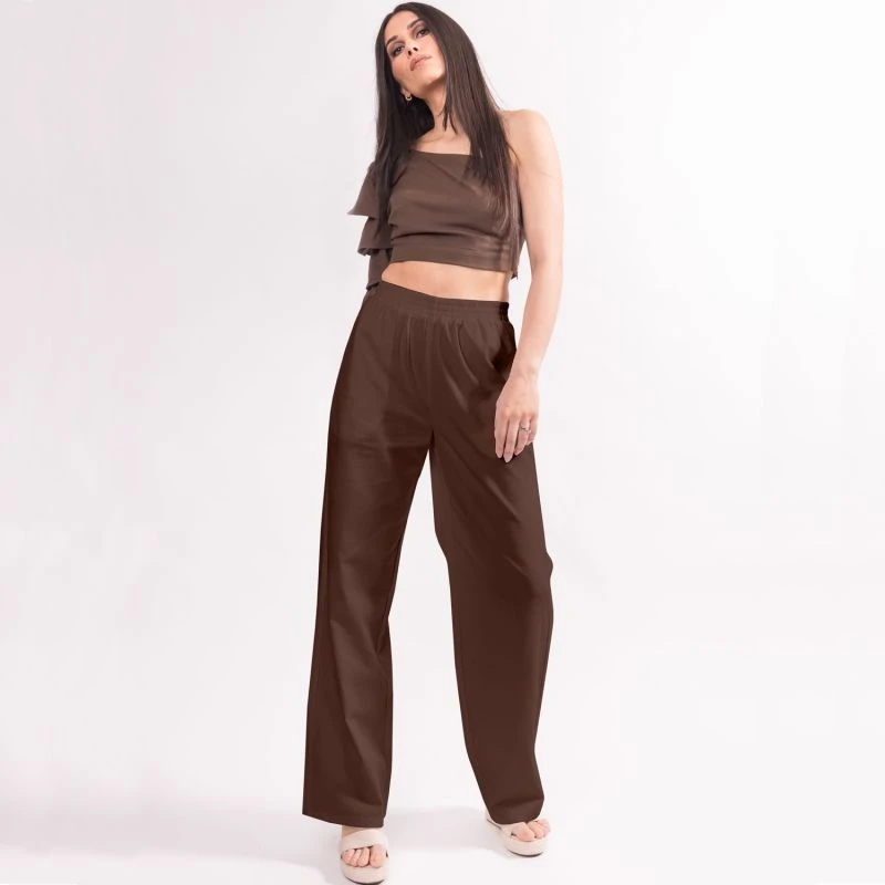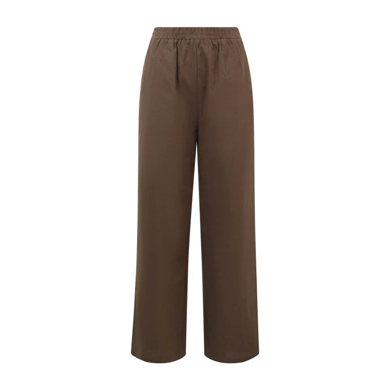 The high waist linen trousers are an essential item for the season. The item features an elasticated high waist, wide leg silhouette and side pockets. The item is available in 3 colours and available as a co-ord set paired with our Frill Sleeve Top.