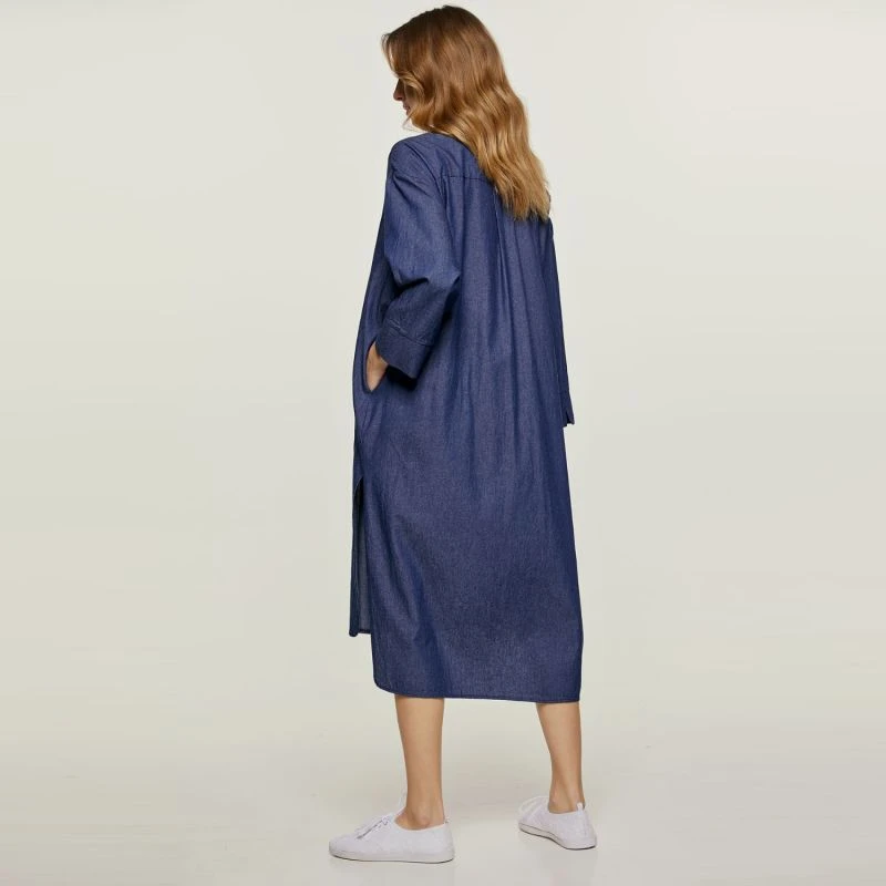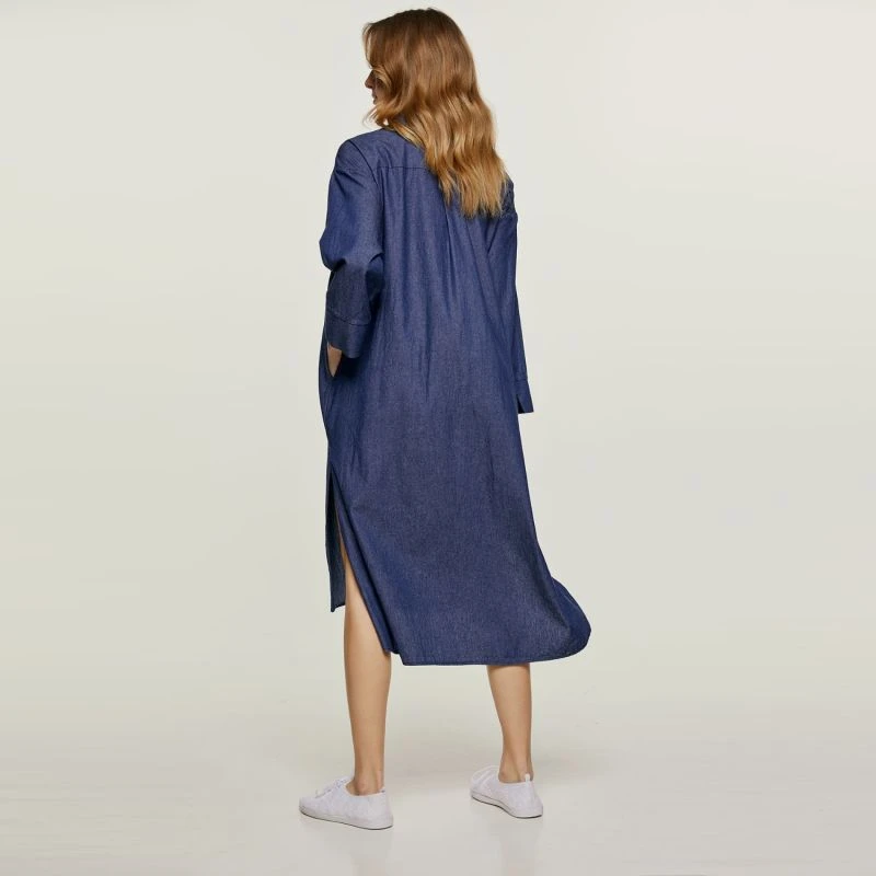 This indigo midi dress is crafted in woven denim style cotton. It has a collar and a concealed placket which fastens in the front with plastic buttons. The sleeves are 7/8 length with cuffs in the same fabric and slits at the finish. The dress has drop shoulders. There is an optional belt in the same fabric. The hem is rounded with long 40cm slits at the sides.
