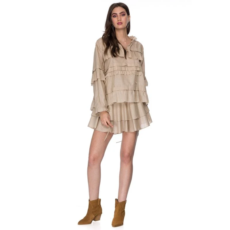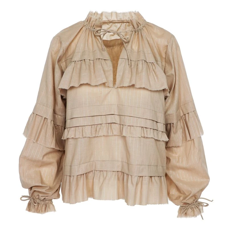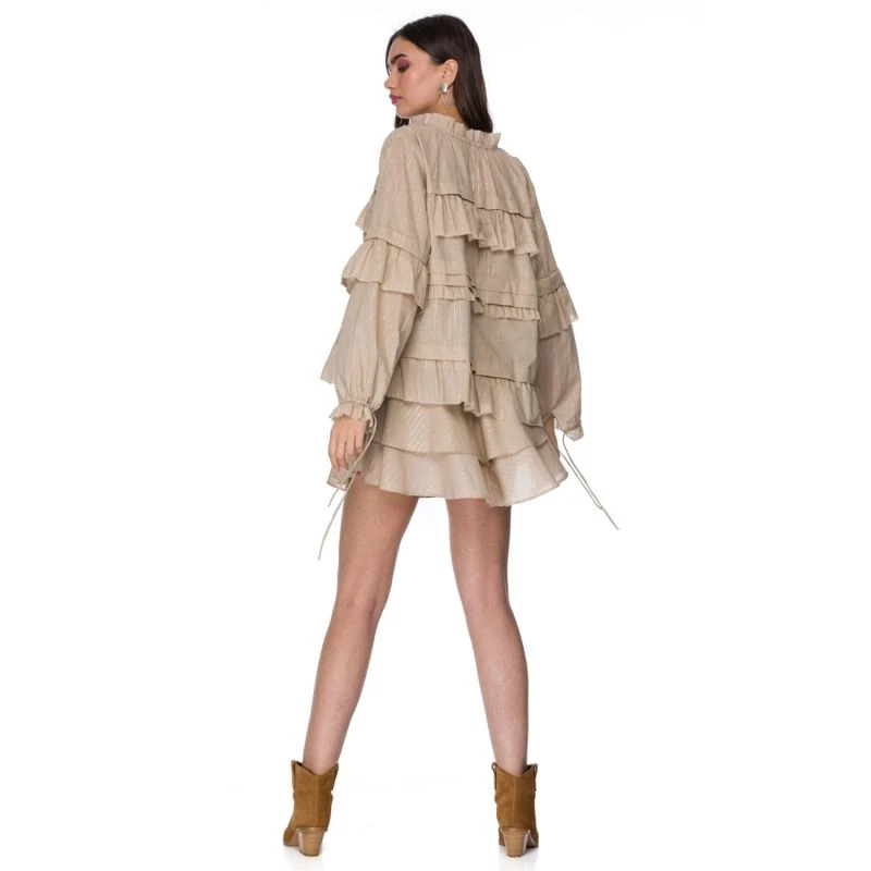 It is made of gorgeous cotton with silver inserts, with an asymmetrical cut. The sleeves and the neck have thin laces at the end