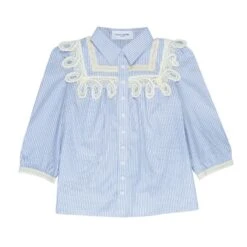 Made with 100%Tencel this couture button-down makes the perfect summertime party/ day ‘fit. Blue and white vertical stripes trimmed in ivory cotton-rich lace and slim mother-of-pearl front buttons. Relaxed fit body and mid-sleeves, gathered chest providing spacious waist hem to keep you cool on sunny days.