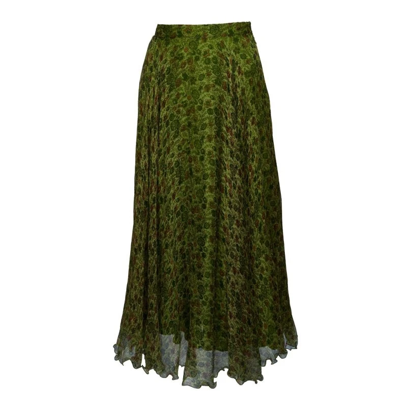Long full circle skirt made in a patterned silk crepon in shades of green. Lined with a coordinated solid green pure silk. Perfect for any occasion combining with the blouse made from the same fabric.