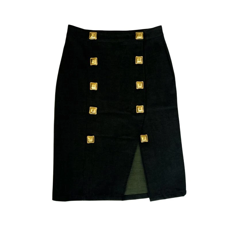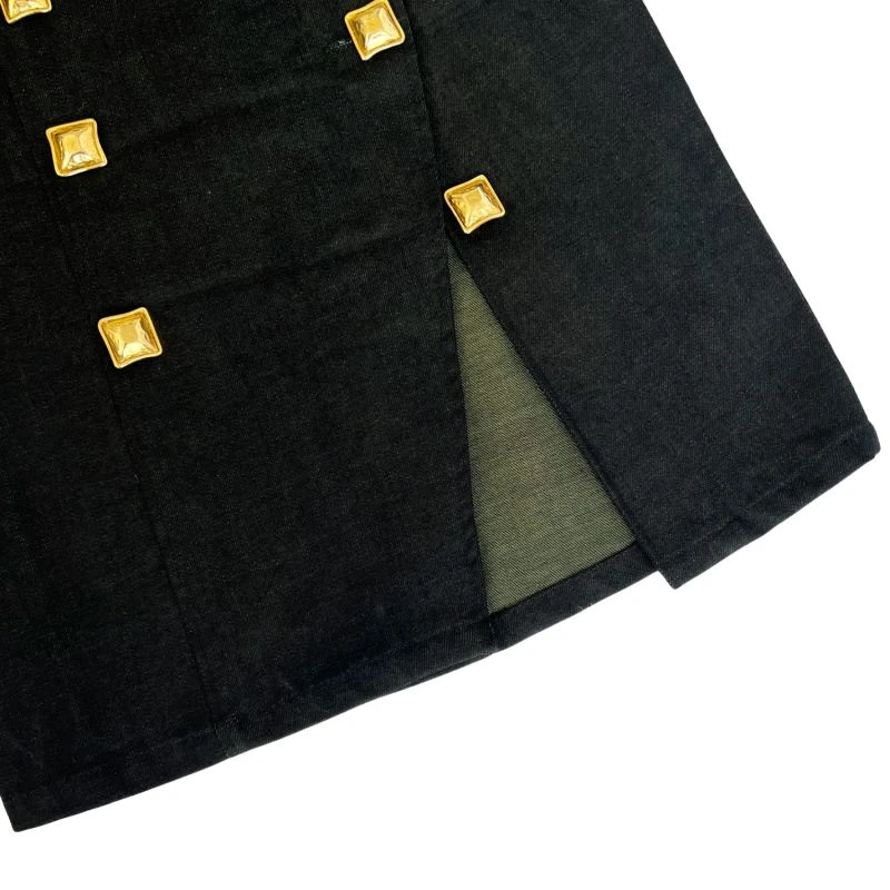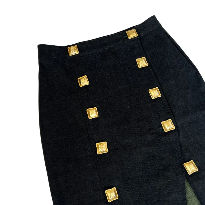 This skirt embodies the combination of high end fashion and streetwear comfort and edge. It is part of the elevated “Majorelle” collection celebrating luxurious details. Cut in a light-weight stretchy denim, it has a classic pencil skirt shape. The front is decorated with vintage inspired gold buttons, opened on a slit. Wear yours with the matching bomber jacket and knee boots for fall.