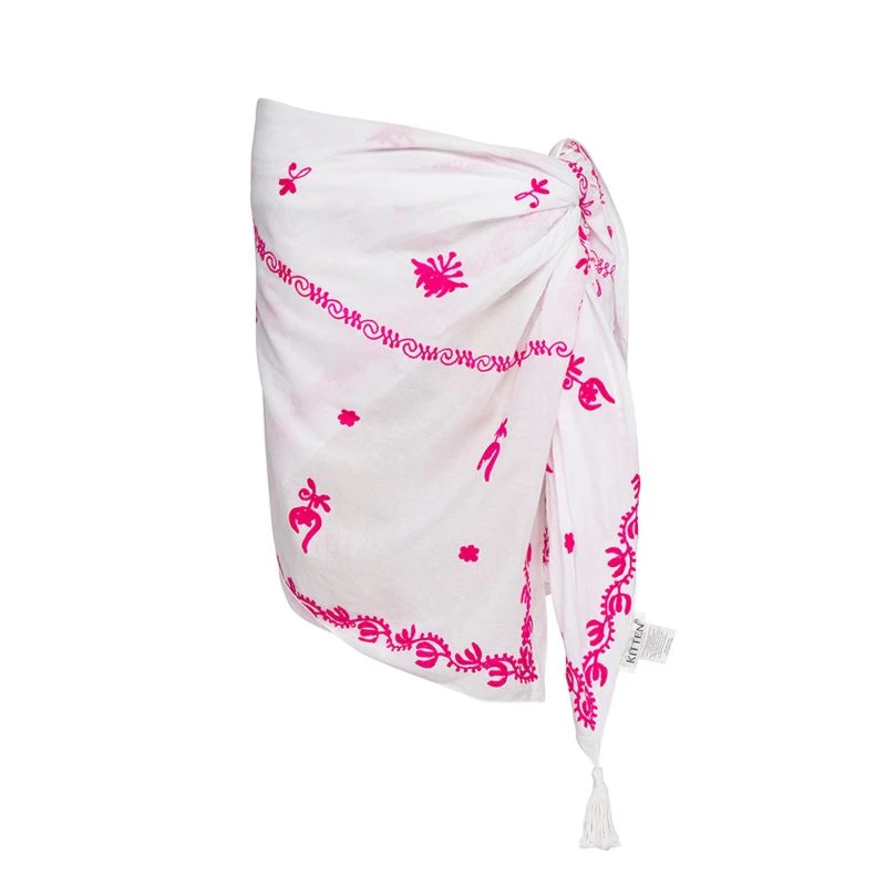 An essential wardrobe addition to wear with your swimwear at the beach or as a chunky neck scarf . The Mykonos sarong is made from the most gorgeous cotton voile with statement hot pink signature embroidered detail and chunky tassels.