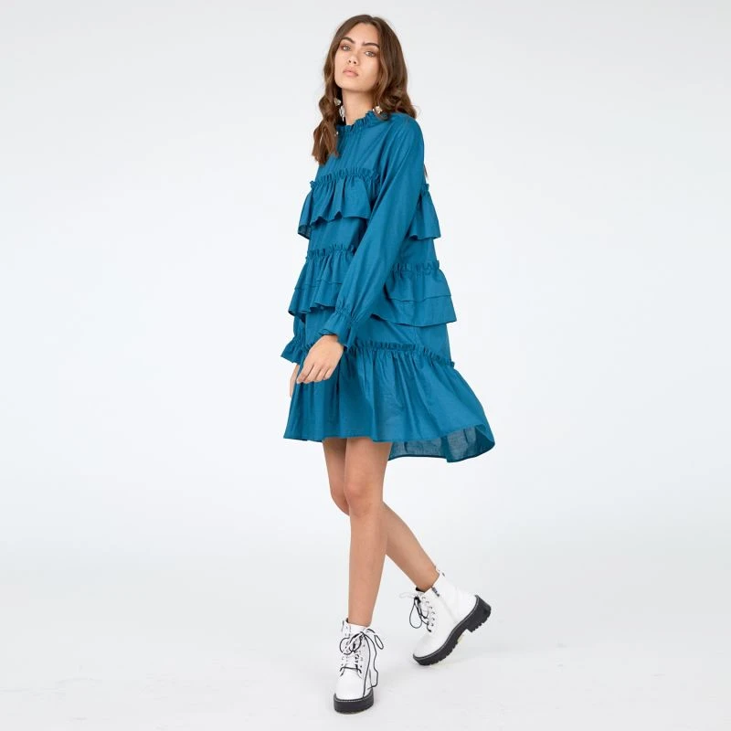 This season we decide to get lost behind the ruffles. Made from soft cotton in a very special hie, Nadia dress has a loose fit silhouette and decorative ruffles. Pair it with a pair of combat boots and nude makeup.