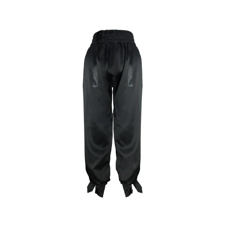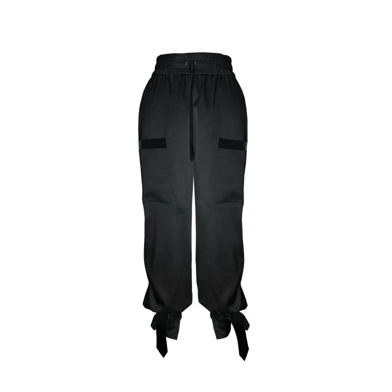 Neptune, with elasticized waistband, is designed in satin and features a black patch pocket on each side and ribbons at the hems and back.