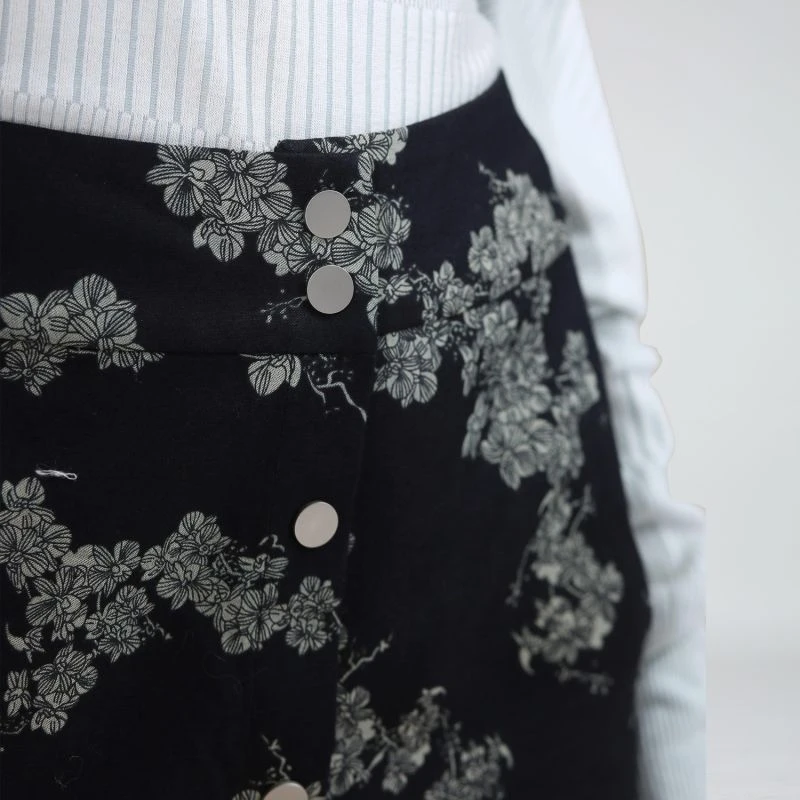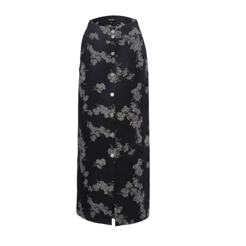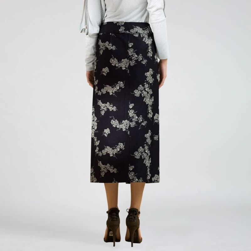 A simple and timeless line available in a subtle floral pattern; this straight denim skirt pairs well with both formal shirts or casual t-shirts. Snap fasteners in the front that allow you to open the from slit as you wish. Safety stich to avoid a full frontal opening.