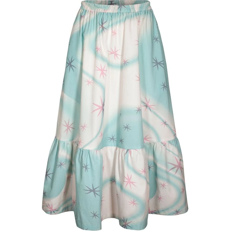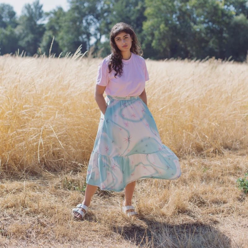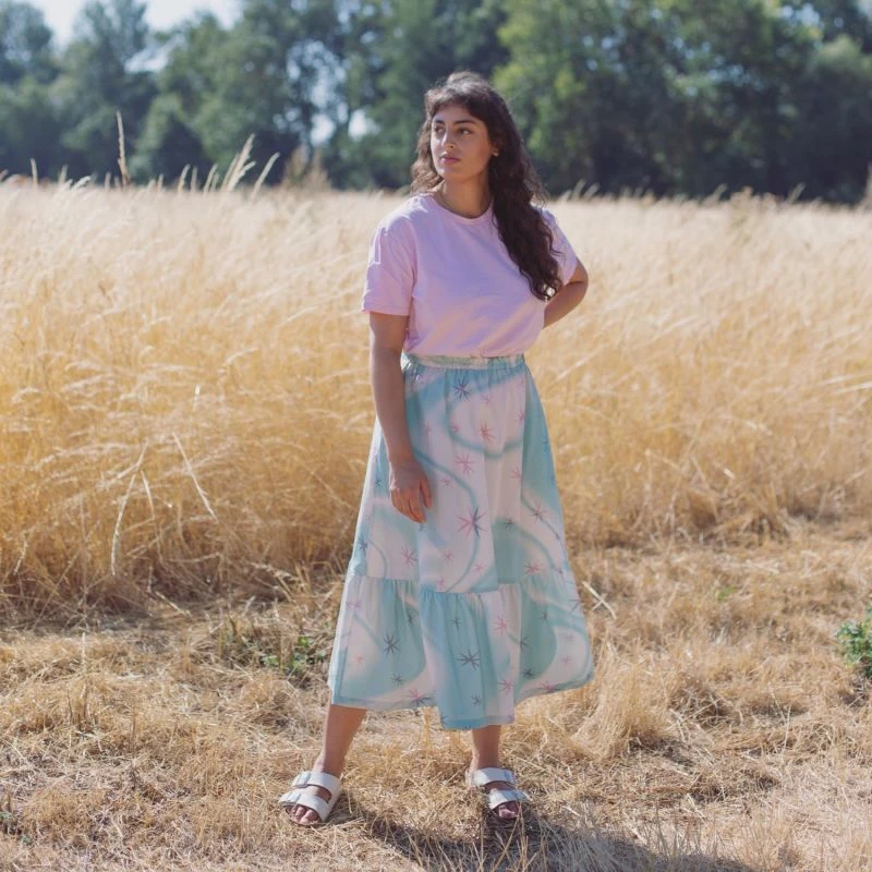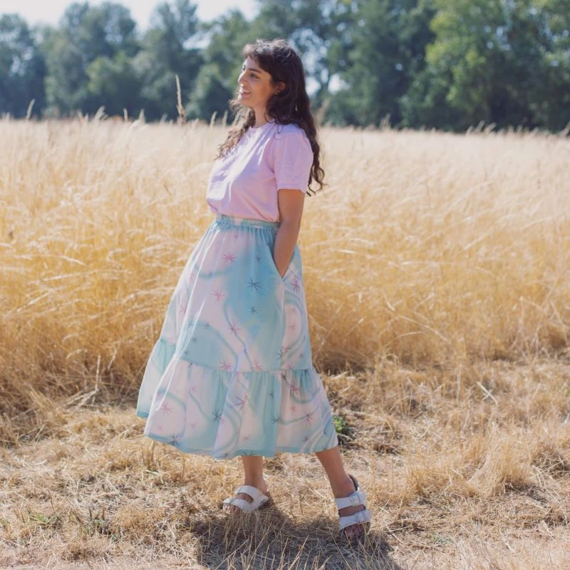 An A-line skirt with floaty tiered hem and elastic waistband, featuring Manimekala’s dreamy swirling star print in light turquoise blue on soft organic cotton. And pockets, of course!