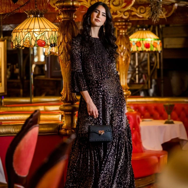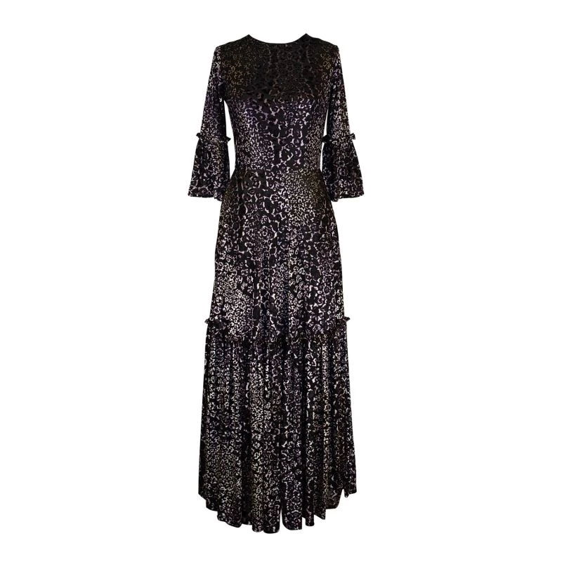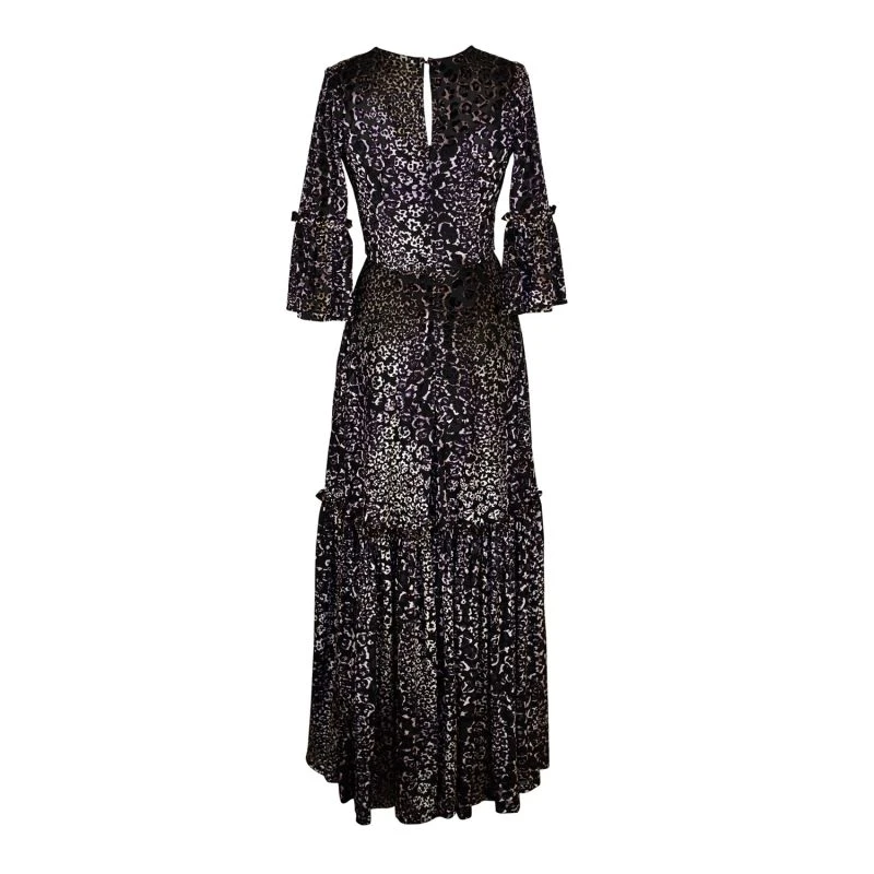 This luscious ruffled maxi dress features a hook & eye neck closure, pockets and a black bamboo blend jersey slip. Made from a ultra light leopard burnout stretch velvet and lots of love!