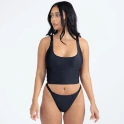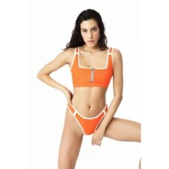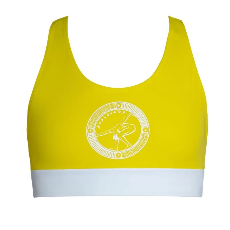 Bikini top with racer back. The colour-contrasting, wide waistband is not only an eye-catcher, but also offers a more comfortable fit. With this piece you are well equipped for sporty beach days with beach volleyball and surfing, but also for swimming laps in the swimming pool. The front part of the bikini top is fully lined and without cups.