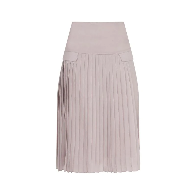 Synthetic shiny like texture, fitted at the waist and around tummy and opens by hips with pleated form, decorative pocket like shapes,mid knee length, daily office chicness