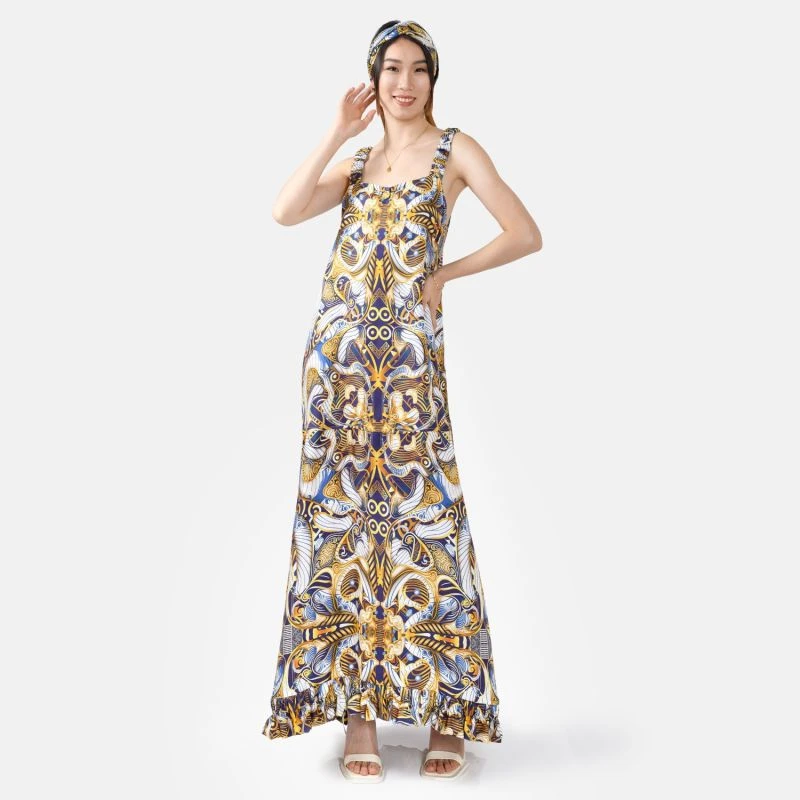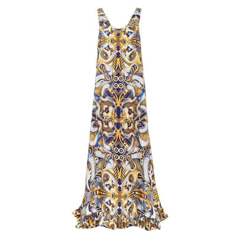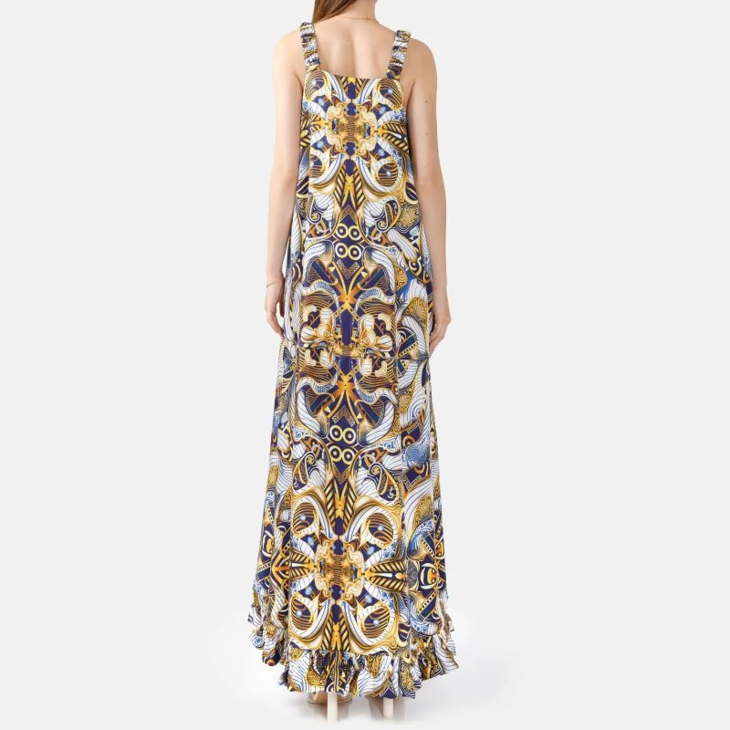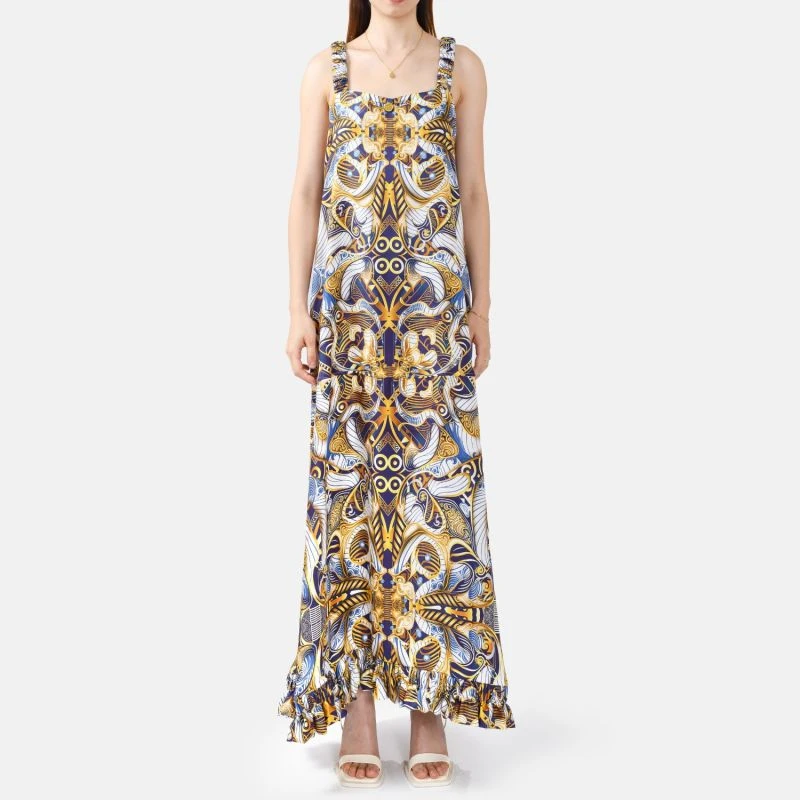 This elegant silk slip maxi dress features a ruffled hem and straps, as well as an alluring gold, blue and white print. Crafted from 100% pure mulberry silk, the dress drapes gently across the skin and shimmers in the light with its luxurious lustre. Balancing designer charm and comfort, you are sure to look and feel incredible night or day in this original statement piece.