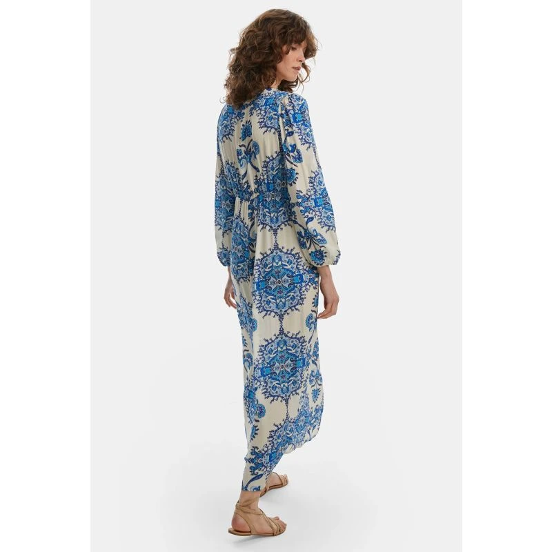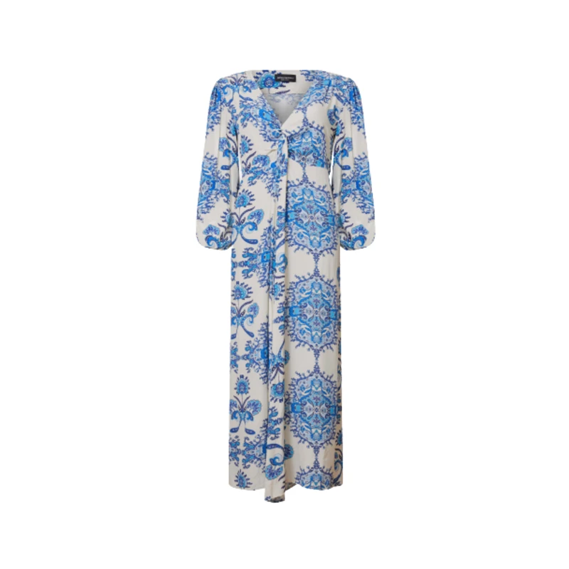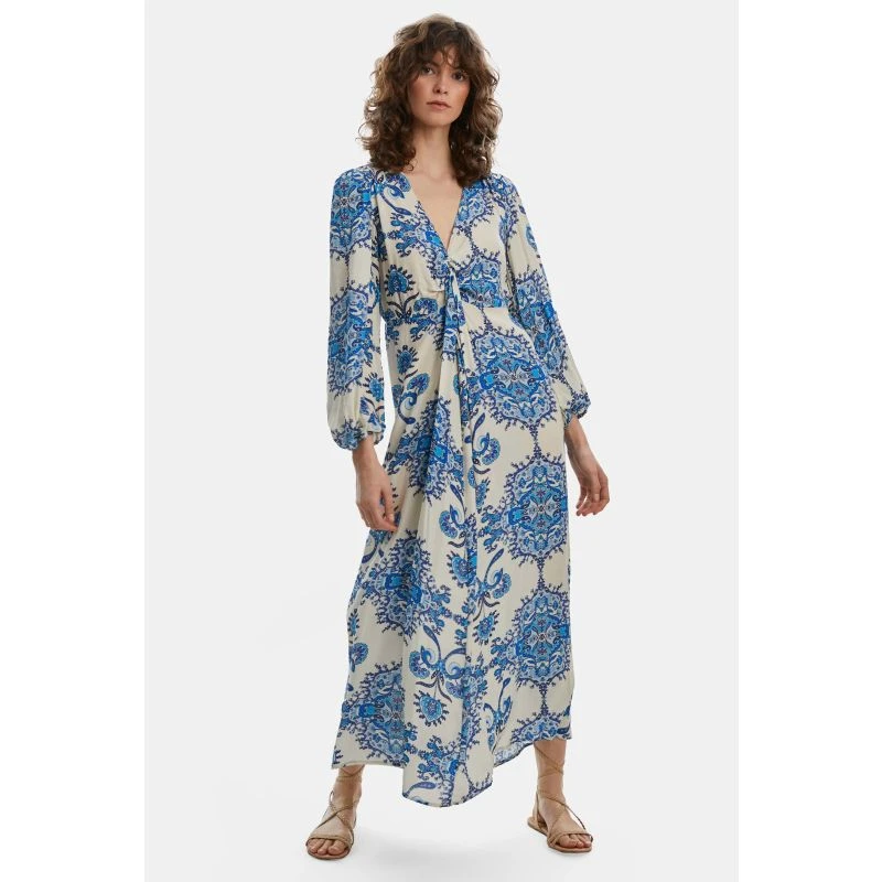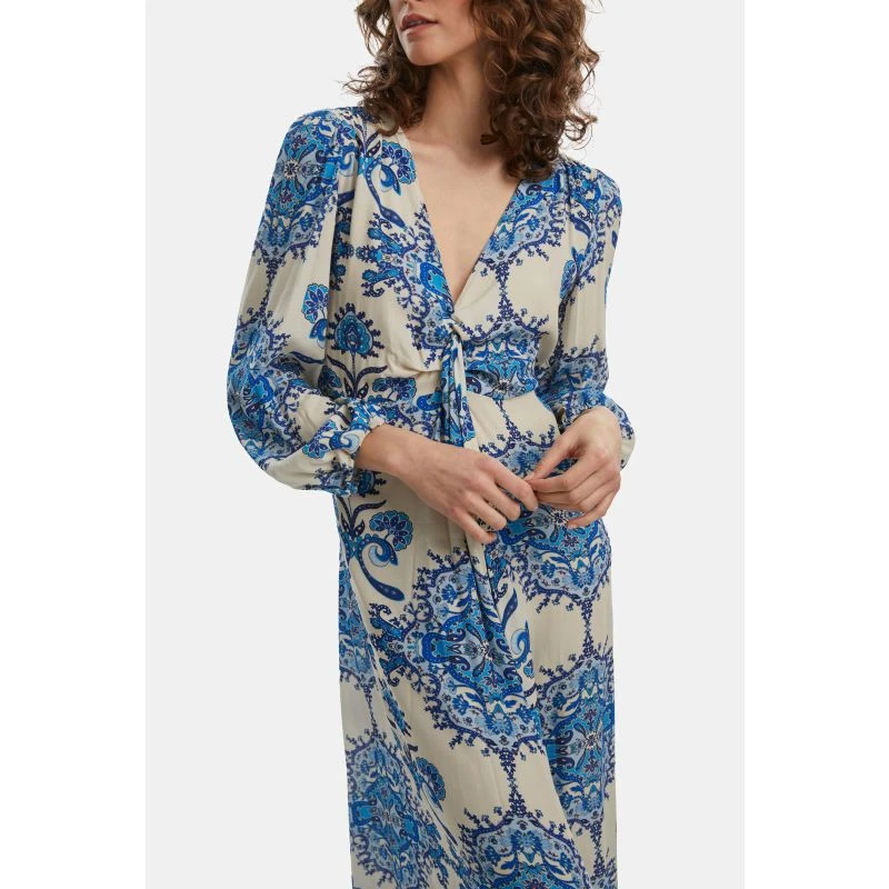This James Lakeland all over print midi dress is an elegant option. Featuring long smoke sleeves, ruched shoulder details, and a plunging neckline ending in a knot, this dress creates a beautifully draped skirt.