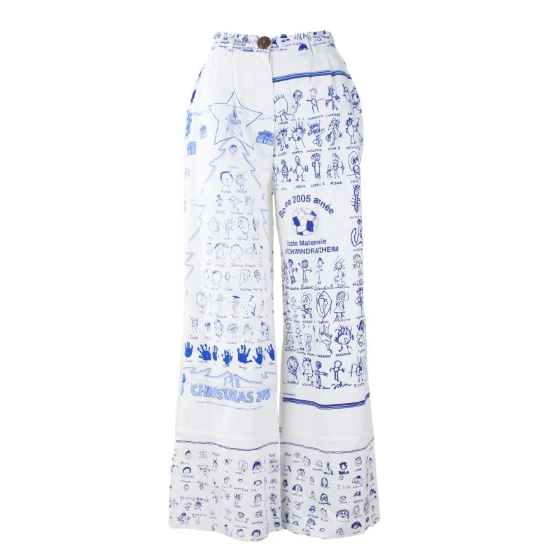 The white trousers feature a mesmerizing blue abstract human print with Christmas detailing, making them a special and exquisite addition to your wardrobe.