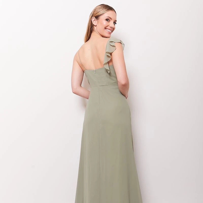 The perfect summer bridesmaid dress our gorgeous Regan dress ticks all the boxes with its boho vibes. Soft ruffles on one shoulder with matching asymmetric ruffled skirt. Perfect for a country or beach wedding the Regan long bridesmaid dress is pretty and playful. Wear again as the perfect summer holiday dress.