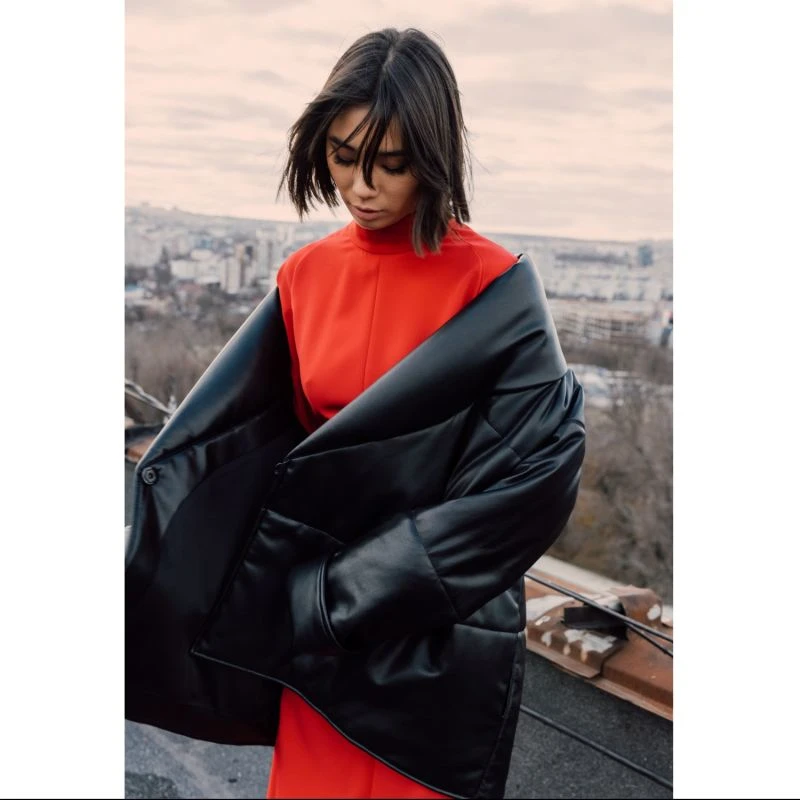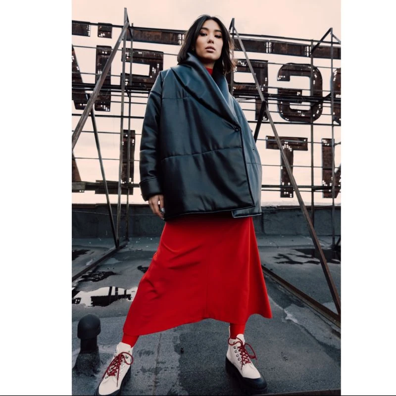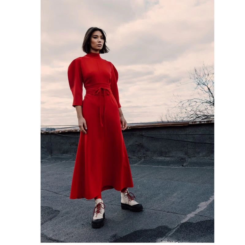 The dress is made in a rich red color from a medium density fabric, slightly stretches. The silhouette of the dress is fitted, the length of the dress is below the knee. A distinctive part of this model is the deortive three-quarter sleeves. The dress comes with a geometric belt of the same color. The dress will suit any type of girl. In it you will become the main character at any event.