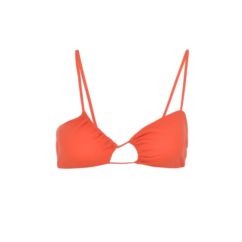 The Red Sky bikini top is designed with an asymmetrical shape and ruching to cups. Cut in a soft material in a colour pop of red. Featuring a cut-out panel at the front, skinny straps and a tie-up fastening at the back with gold-tone sun trim to ends. Match with the Red Sky bikini bottoms