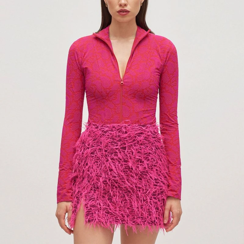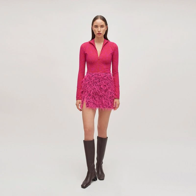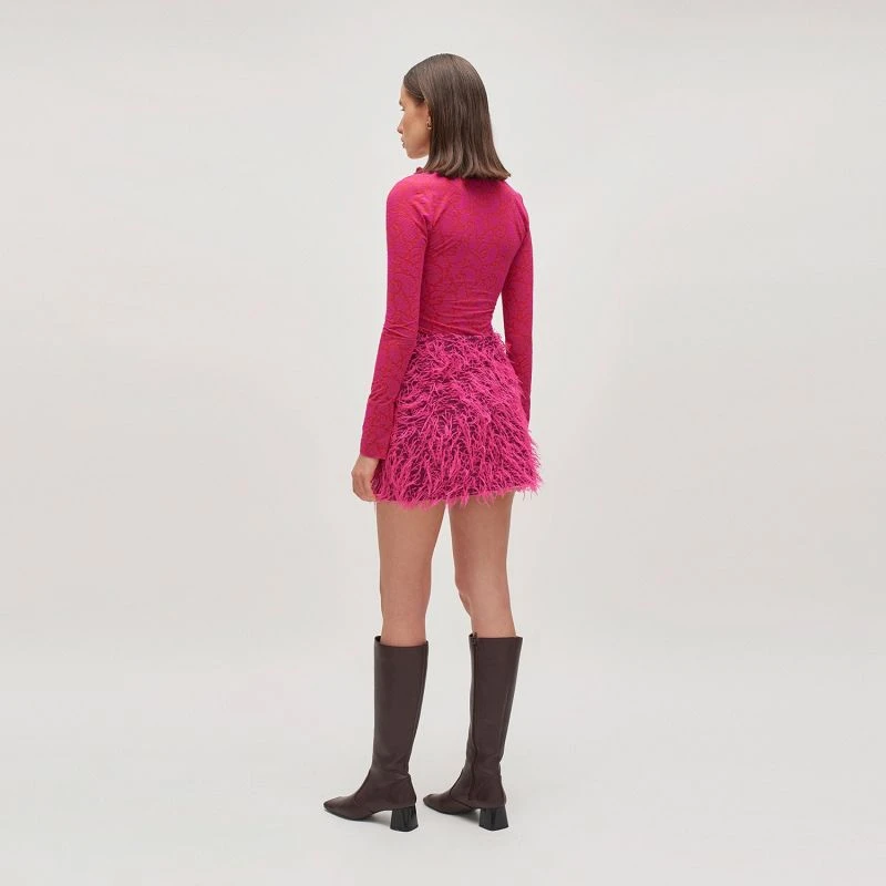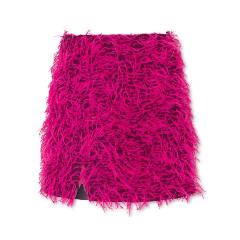 There are miniskirts and then there is the ROOSTER mini skirt. It’s sure to turn heads with its bold fuchsia color and unique faux fur texture. A feminine piece yet a bit of a weirdo, you can wear it during the day paired with a sweater as well as on a night out on the town.