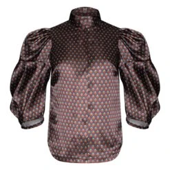 An iridescent satin feel with extravagant balloon sleeves to the elbow, the Salvar features a high ruffle neck and press stud fastenings.