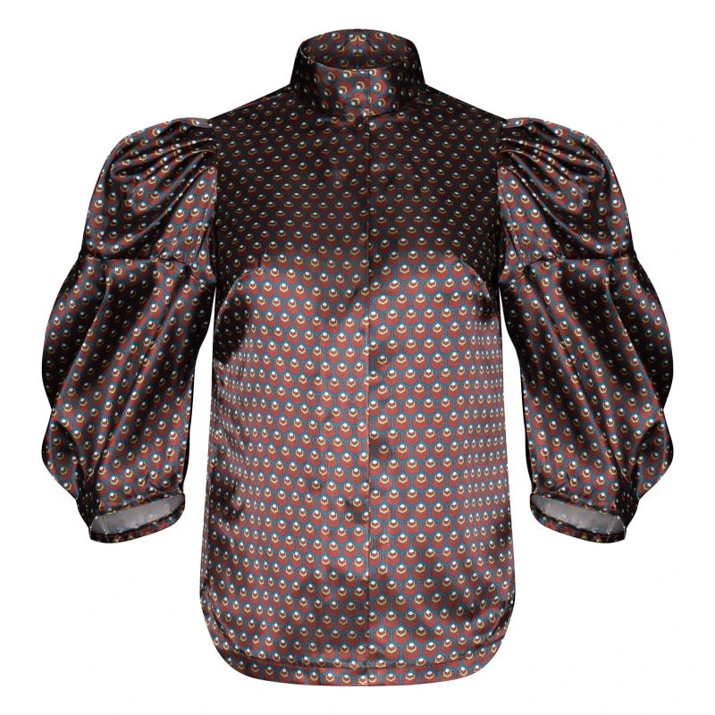 Haute couture and sustainability align in the Salvar shirt through the use of 100% polyester, vegan, roll end, designer fabric. Inclusive sizing, available in XS to 6XL.