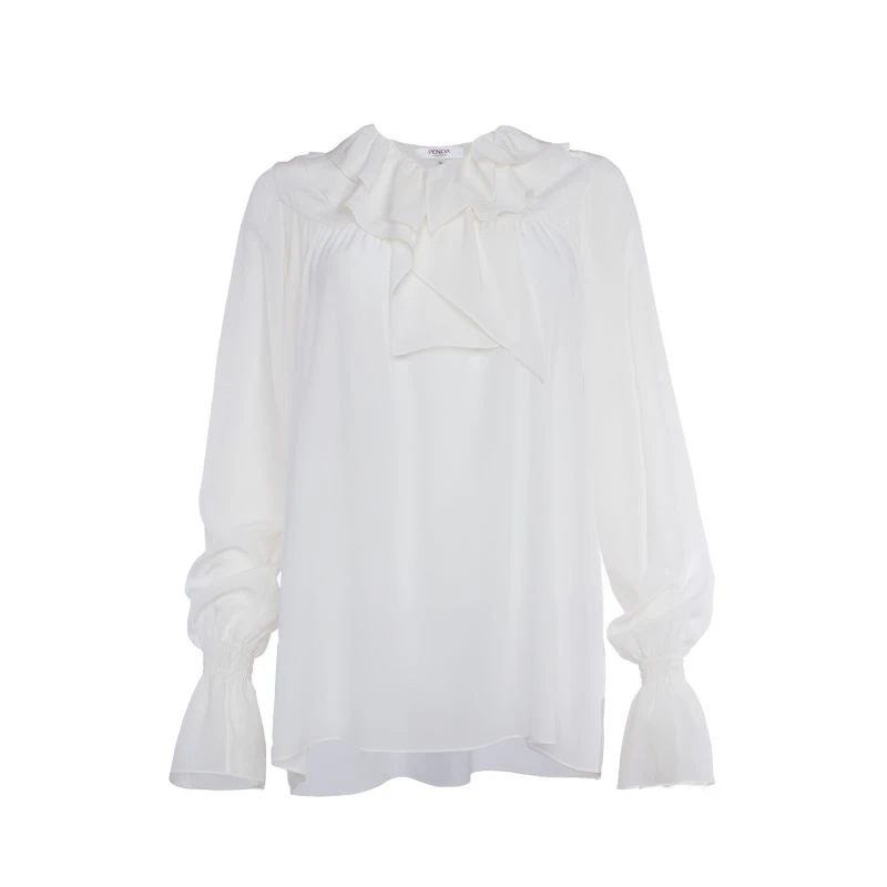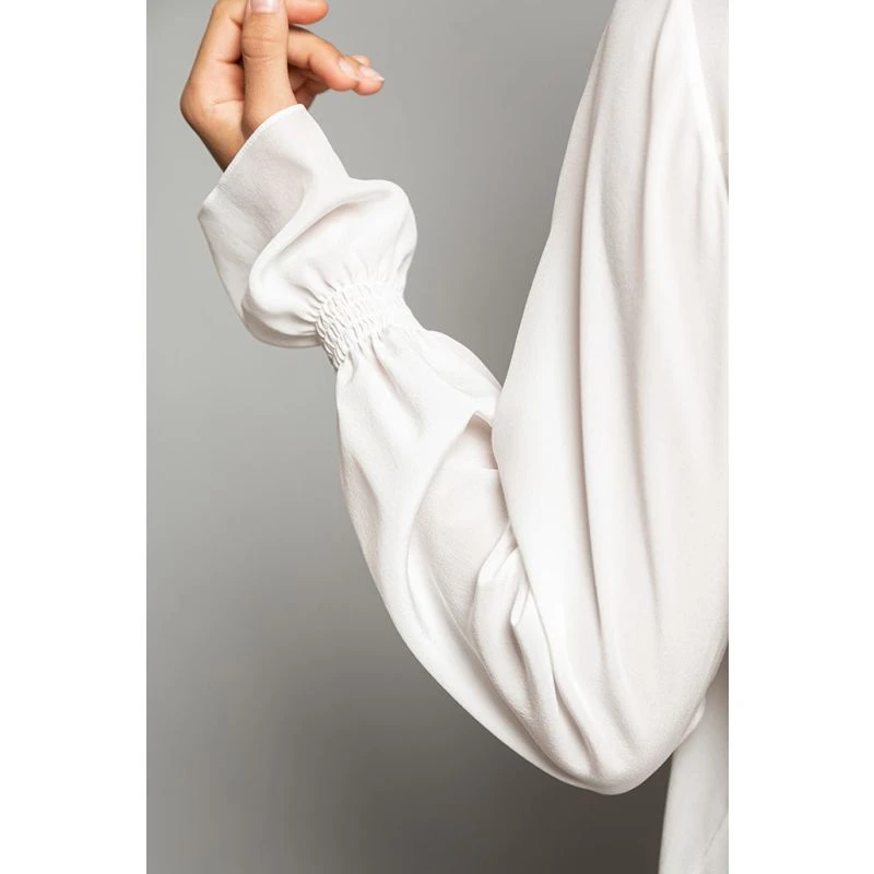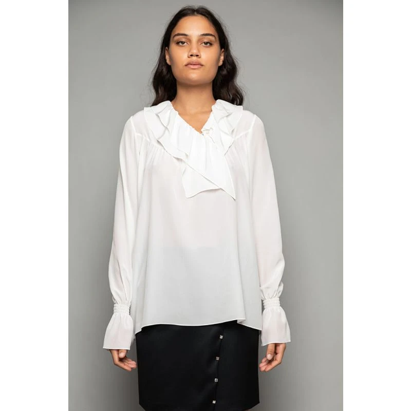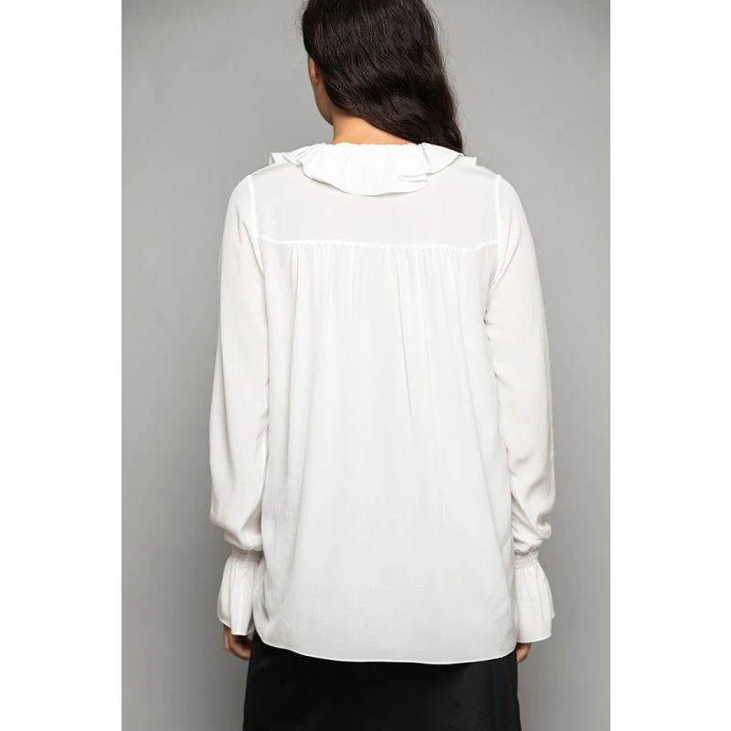 This chic blouse has ruffled details around the neck. Its mother-of-pearl buttons at the front and its long delicate sleeves with smocked cuffs at the wrist accentuate a balance between delicateness and femininity, to enhance its chic effortless attitude.