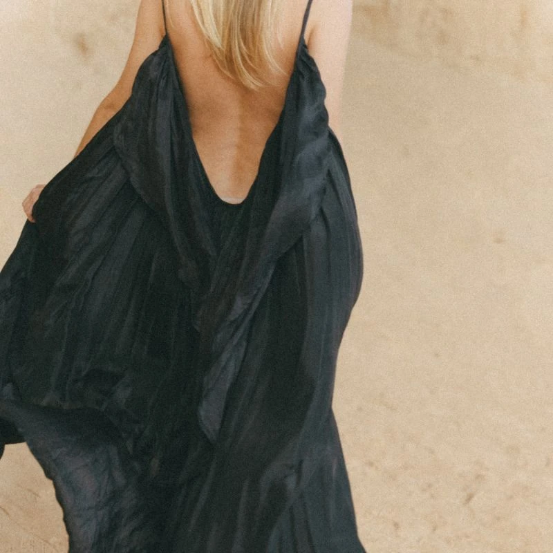 Nomadic locations inspire the natural textures and elegantly dramatic silhouettes that define our collections. This style has been hand made in India cut from 100% organic silk that falls loosely to a floor-sweeping tiered hem with ultra low back. The floaty ‘Syros’ has been hand dyed in a golden palm green for the ultimate go to statement dress. Bohemian and luxurious to take you effortlessly from the beach into the evening year after year.